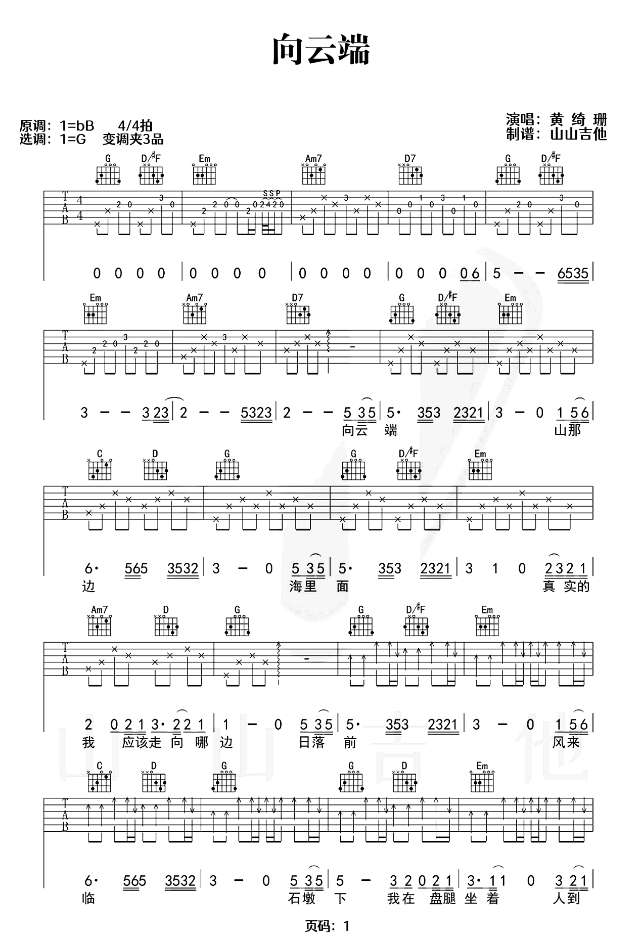 曲谱介绍: 向云端吉他谱,黄绮珊演唱,高三的同学们在都正式毕业了,毕业歌曲《向云端》安排上,这首歌真的太治愈啦。《向云端》吉他弹唱谱,原调降B调,选用G调和弦指法编配,变调夹Capo3品,六线谱共三张图片谱例,感谢山山吉他编配出品,琴谱网网站整理更新。 向云端,追逐梦想的方向;走向山那边,攀登人生的高峰;踏上海里面,探索未知的领域。无论前方道路怎样崎岖,我们需要勇敢去追寻内心真实的自我,才能发现属于自己的道路和意义。从云端、山巅、海底,收获经验与成长,才能展翅飞翔,创造出更加美好的未来。