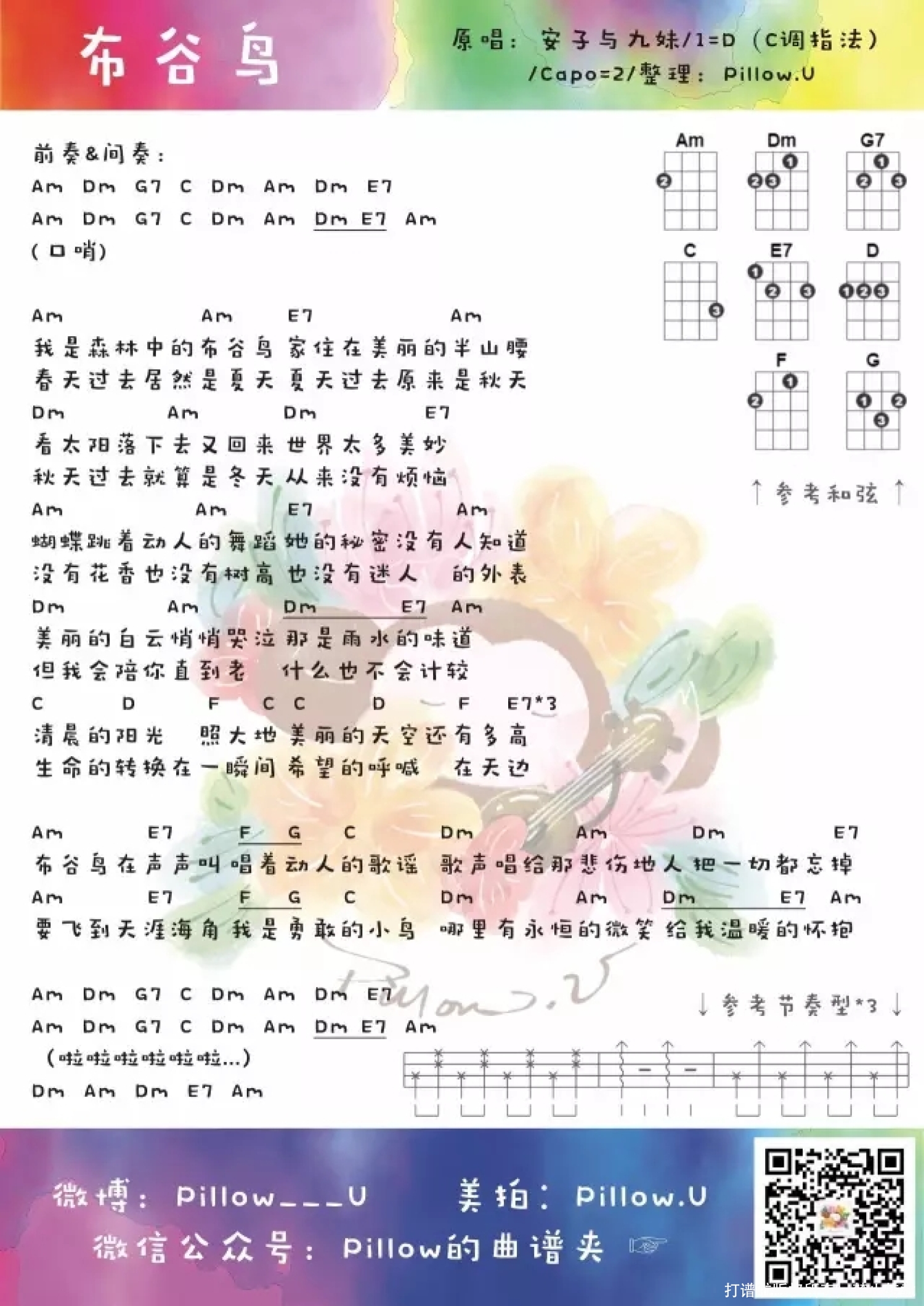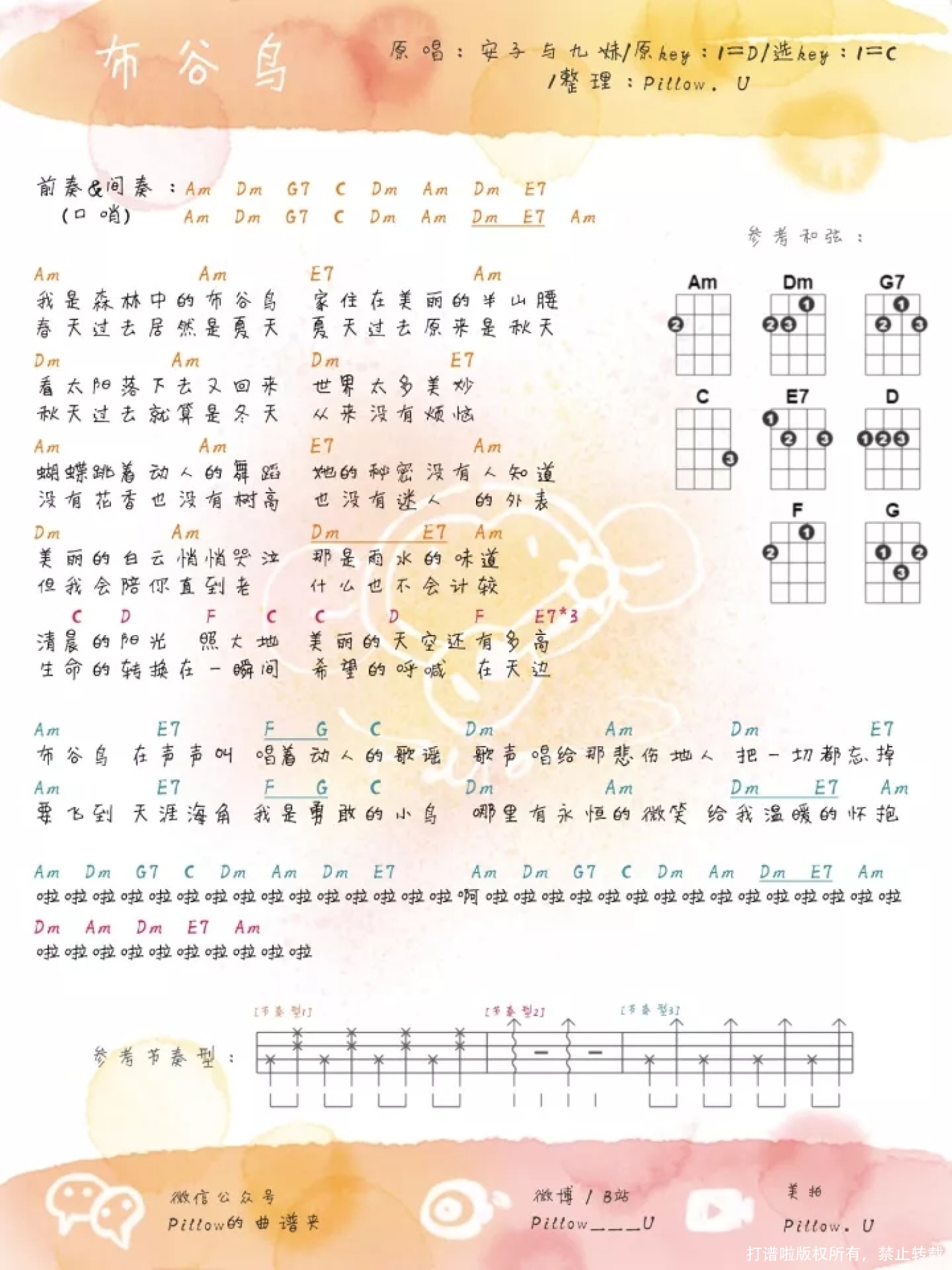 曲谱介绍: 我猜你也喜欢民谣,却不曾听过{安子与九妹}这么民族、青春、活泼、正能量、洒脱、摇滚…的“民谣乐队”。 接下来的周更里可能会时常出现安九的歌,因为看完他们武汉站巡演的我,又开始了扒谱大业。安九官方出品的吉他谱目前只有3份,我全部整理编配成了尤克里里谱,接下来会慢慢放出。其余没有官方谱的歌,Pillow正磨洋工地一个个解锁。 几份谱子下来,我大概已经发现了安九在编配上的一些规律,或者说是小习惯。就先立个flag,看看什么时候能全部搞掂吧。 有人说安九的歌不太好cover,有很多奇奇怪怪的发音,而且单一的配器撑不起那洒脱的节奏感。那不如让这些歌伴着单薄的尤克里里声变成一抹小清新吧(๑*◡*๑) 这首{布谷鸟}是我的入坑曲。记得第一次cover这首歌的时候,各种不稳定,现在看真是分分钟都想销毁视频。但我还是勇敢地翻出了这个视频,顺便怀念一下当时那个有镜子视角的小房间。 (Pillow的布谷鸟初次Cover) 此后我又重新整理了和弦和节奏型,也调整了很多细节。直到今年初在上海听了安九现场的{布谷鸟},录回来视频反复看,决定花上一阵子背词背谱,重新抠一些细节。诶,现在我可以唱“不靠谱”的布谷鸟了! 布谷鸟ukulele弹唱谱 关于调的问题。原曲是变调夹夹2品唱的,我也坚持这么唱了一阵子,后来觉得一直吊着高音实在扛不住,所以现在我都是变调夹夹1品。也许哪天嗓子不行了,再考虑一下不夹变调夹,或者降半音调弦吧。 BTW,很多人问过一个问题,就是:你开头那几个音弹的是什么? 原版里是以4个Am和弦起的头,其中有用到吉他根音的变化。尤克里里几乎没有在谈根音的概念,所以我给改成了Am-E-Am的开头,具体是哪几个音,你们按着和弦找一下就知道啦。   老版: