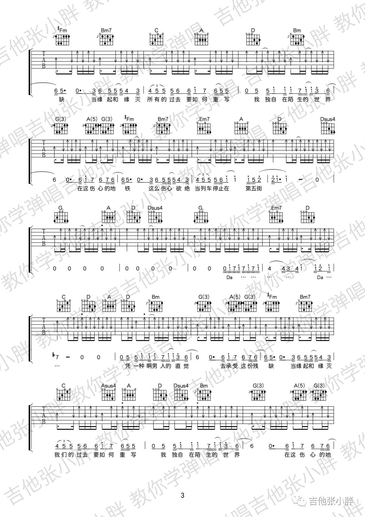 曲谱介绍: 伤心地铁吉他谱,D调指法吉他弹唱谱,来自张小胖编配版弹唱六线谱,共四张图谱,附演示示范。歌曲难度较大,不太适合初学者,弹奏之前最好能熟练把握封闭和弦的指法。“当缘起和缘灭,我们的过去已不能重写。我失去了全部的世界,在这伤心的地铁”。李宗盛《伤心地铁》,有没有那么一个人,曾是你的全世界?在这首歌里,李宗盛把那份失去挚爱的深沉,唱出了一种看透尘世的感觉。