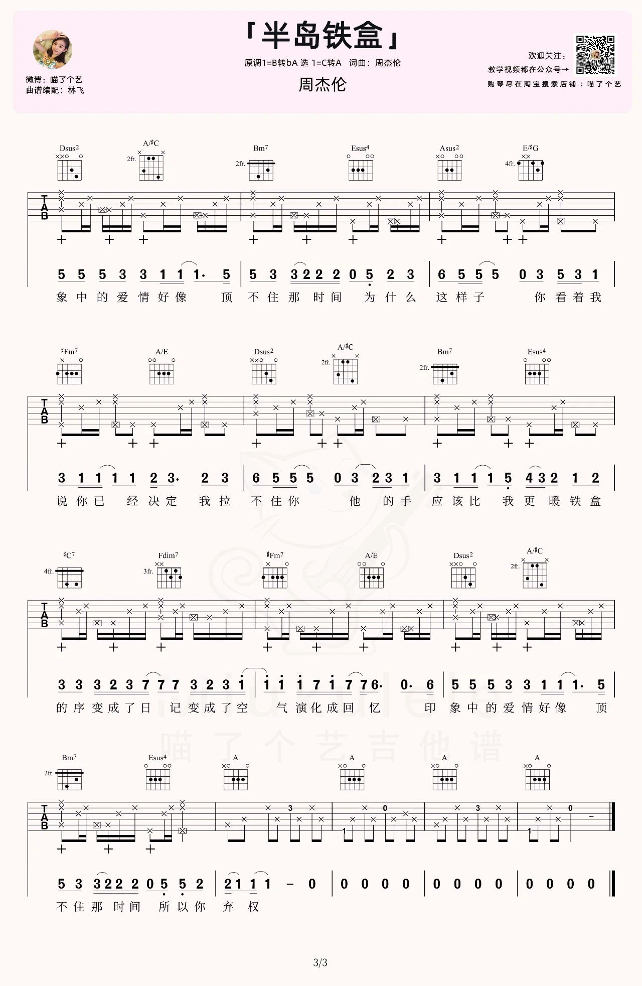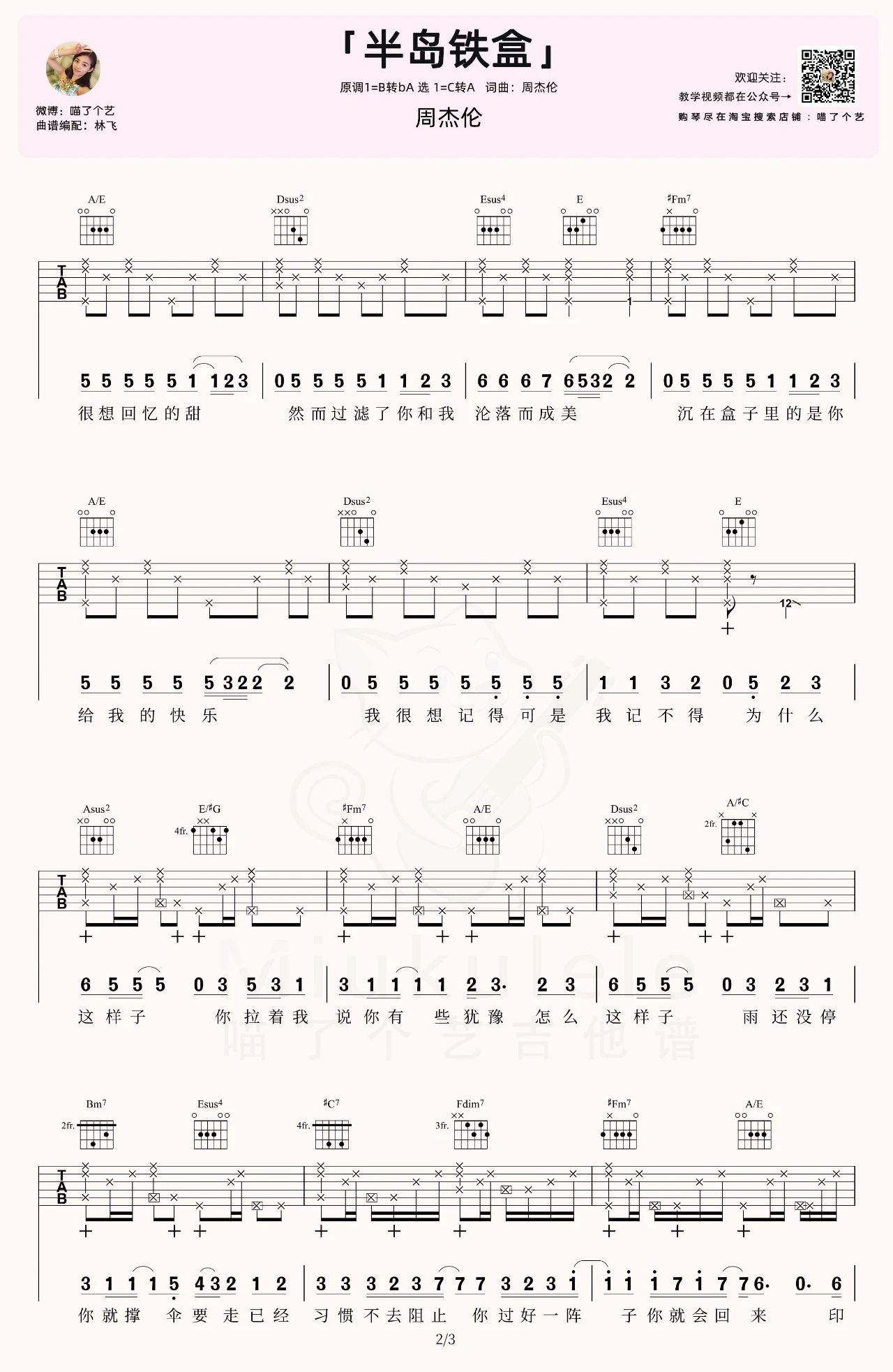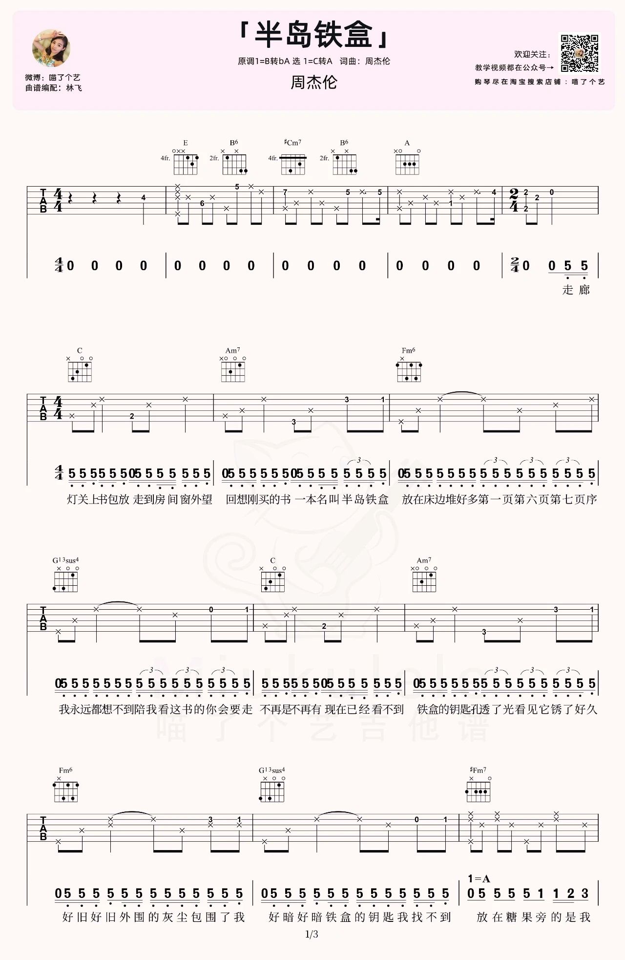 曲谱介绍: 半岛铁盒吉他谱,来自喵了个艺编配弹唱六线谱,C转A调版弹唱谱,共三张谱例,附演示示范视频。甜蜜的回忆锁在盒子里,然而钥匙孔却锈了好久。以为你会和往常一样回来,但时间最后还是带走了你。半岛铁盒是一本书,书的序里记录的是纷飞的回忆;半岛铁盒是一个音乐盒,音乐里回想的是远去的爱情。