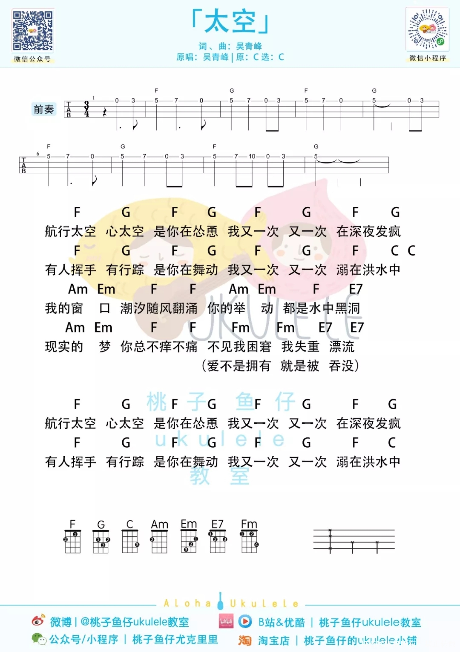 曲谱介绍: 青峰的歌对我而言是一种贴心的治愈 听他的歌总是让人觉得放松释然 偶然看综艺的时候 发现他是个很温暖的男孩子 即便你做的不够好 或是你本身很棒 他不会吝啬给你鼓励 在我心里他就是个暖心的小天使 青峰这次发布的新歌《太空》 相信歌里的情感大家都能有所意会   太空ukulele谱