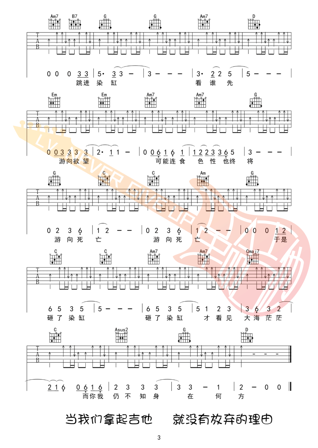 曲谱介绍: 草东没有派对演唱的一首歌曲,4/4拍的节奏,这首歌曲的原调为A调,这里曲谱采用了G调指法进行编配,演唱时夹变调夹2品可回到原调,也可根据个人实际嗓音情况选择。曲谱由琴谱网更新上传,来源于@革命吉他编配出品。词和编曲皆佳的一首歌,歌词比之前的《山海》,《大风吹》更容易理解。人们都在缸里比赛,终点就是满足自己的欲望,欲望就像数字一样膨胀,没有尽头。  吉他弹唱演示及视频教学
