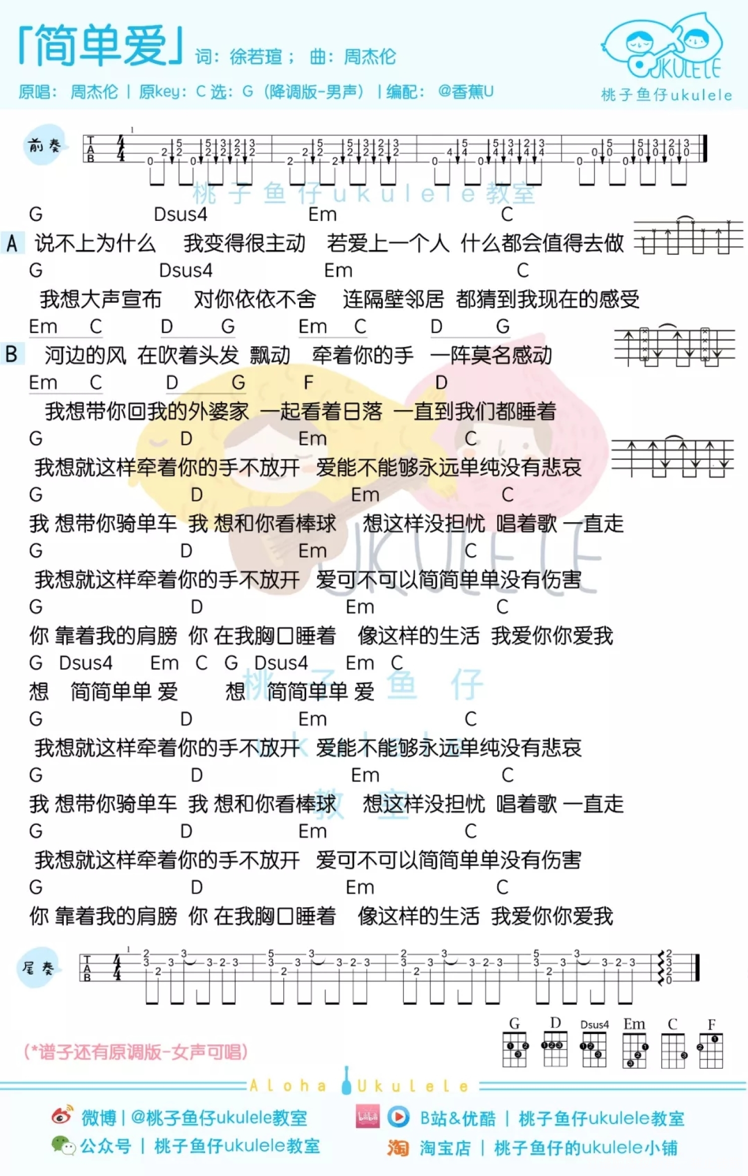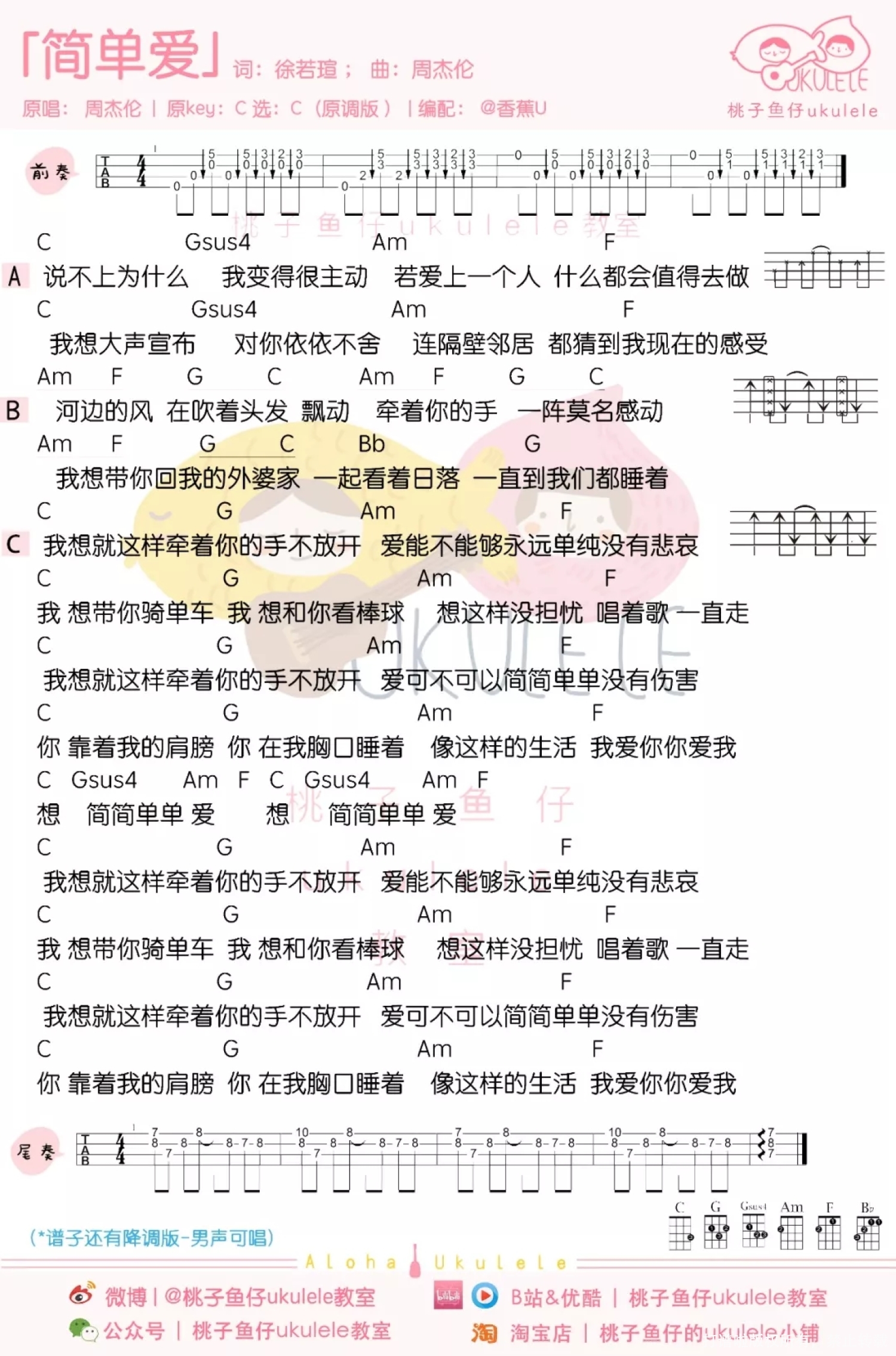 曲谱介绍: ukulele + 吉他 弹唱演示   简单爱ukulele弹唱教学   简单爱ukulele弹唱谱 1、女声版   2、男声版