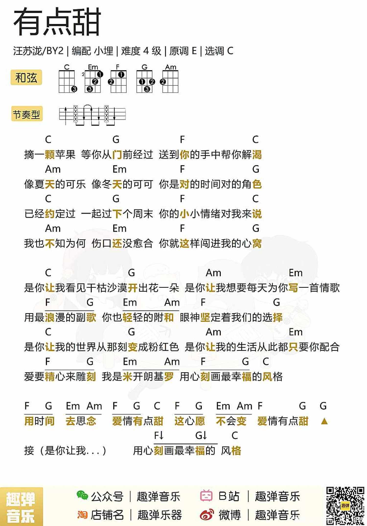 曲谱介绍: aloha~ 今天要教大家一首甜甜的歌 汪苏泷和By2合唱的「有点甜」 希望这个七夕节,所有小伙伴 都不止一点点甜~   🎤每天喝奶茶最积极の杏子老师: Aloha~祝大家七夕快乐,今天挑了首非常应景的歌,希望大家不止是今天,今后的每一天都是甜甜哒~ 单身的小伙伴们也不要觉得酸🍋🍋,和我一样一边霍着奶茶一边学习这首歌,双倍的糖分也是爽到不行~   有点甜丨Ukulele教学   有点甜ukulele弹唱谱