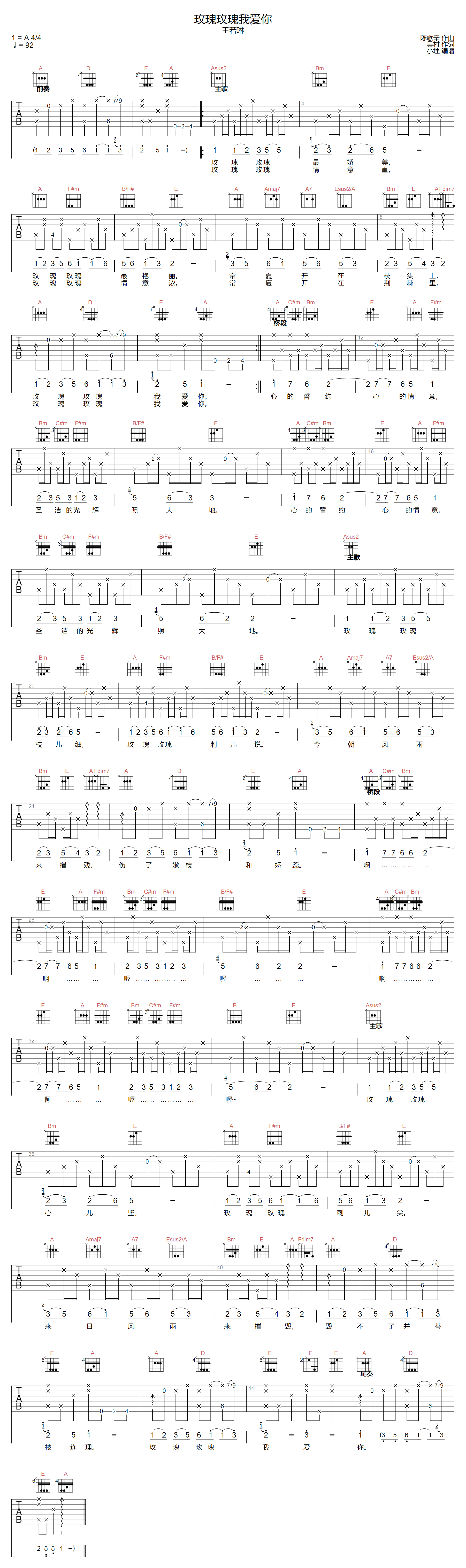 玫瑰玫瑰我爱你吉他谱 - 王若琳 - A调吉他弹唱谱