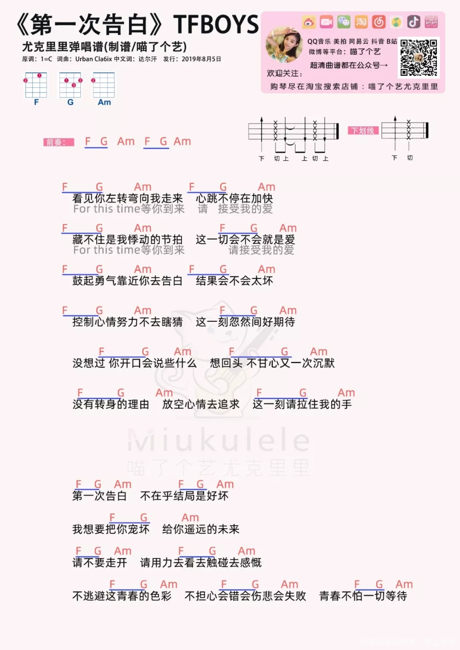 曲谱介绍: 今日份弹唱|TFBOYS《第一次告白》 虽然票抢不到很伤心,黄牛票贵上天很生气,但是新歌还是要快乐打call!看我这身黑衣服,跟《第一个告白》的舞蹈室练习视频配不配。   第一次告白 ukulele cover   第一次告白ukulele教学   第一次告白ukulele谱