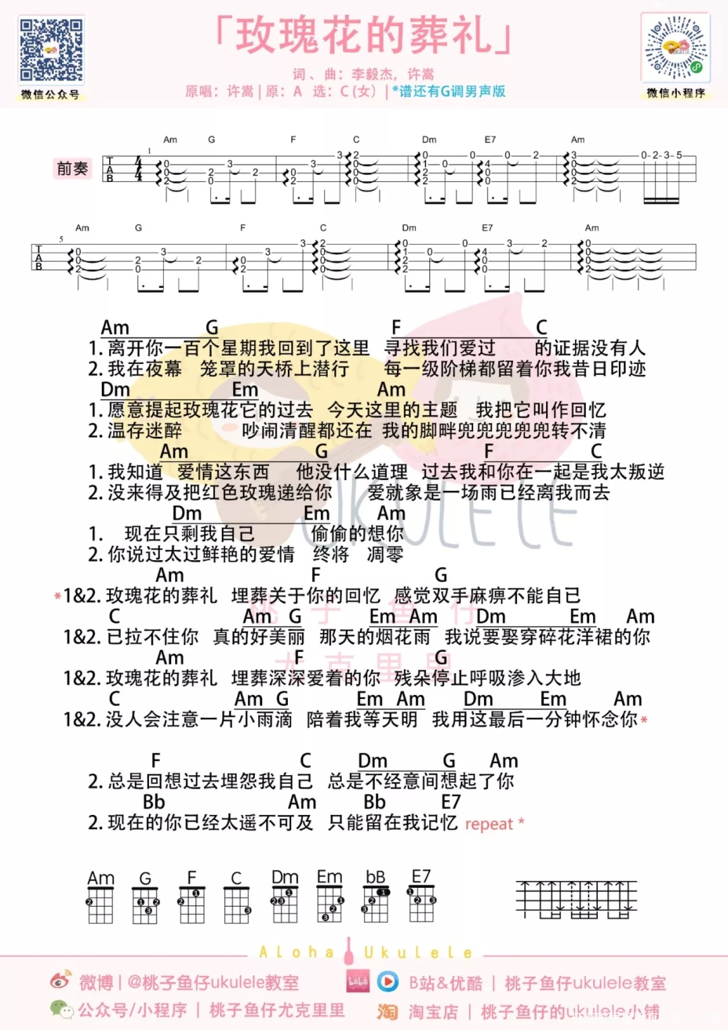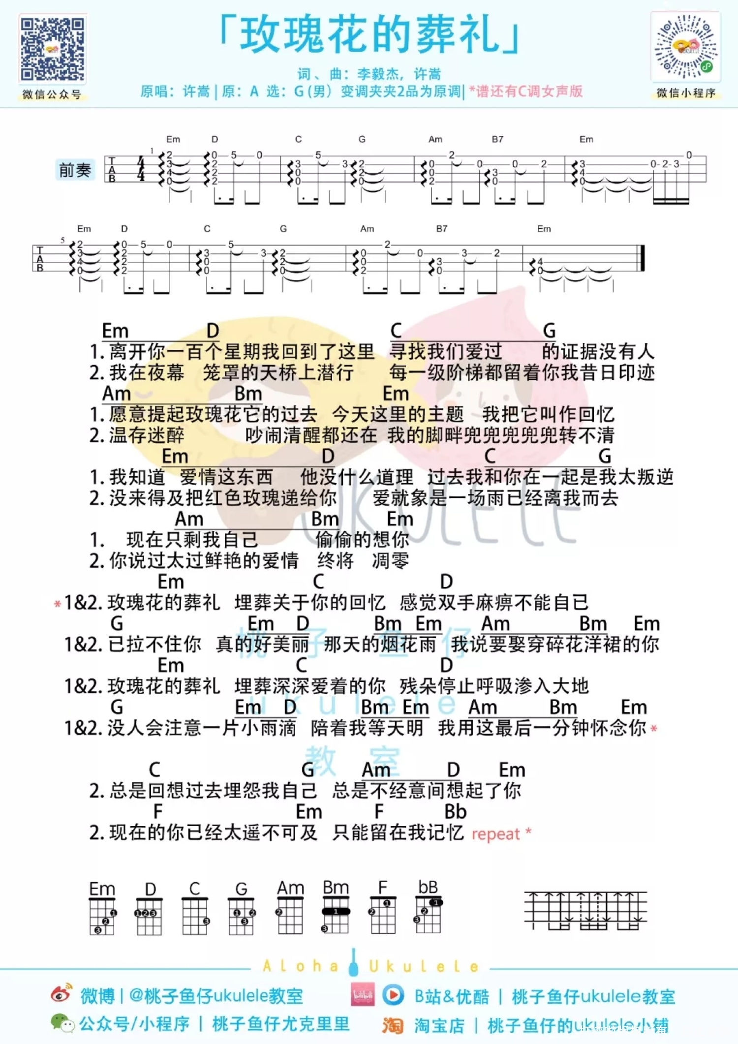 曲谱介绍: 听周杰伦的歌是青春 听许嵩的歌也是青春 音乐哪有高低等级之分 我开始听许嵩的歌 是因为我关系很好的堂哥 那会我还只是个小学生 我记得哥哥的电脑播放器列表 全是许嵩的歌 这么多年了 他仍然很喜欢许嵩的歌 其实我想说 自己喜欢就好 不用去管什么流言蜚语   玫瑰花的葬礼尤克里里谱 1、女声版   2、男声版