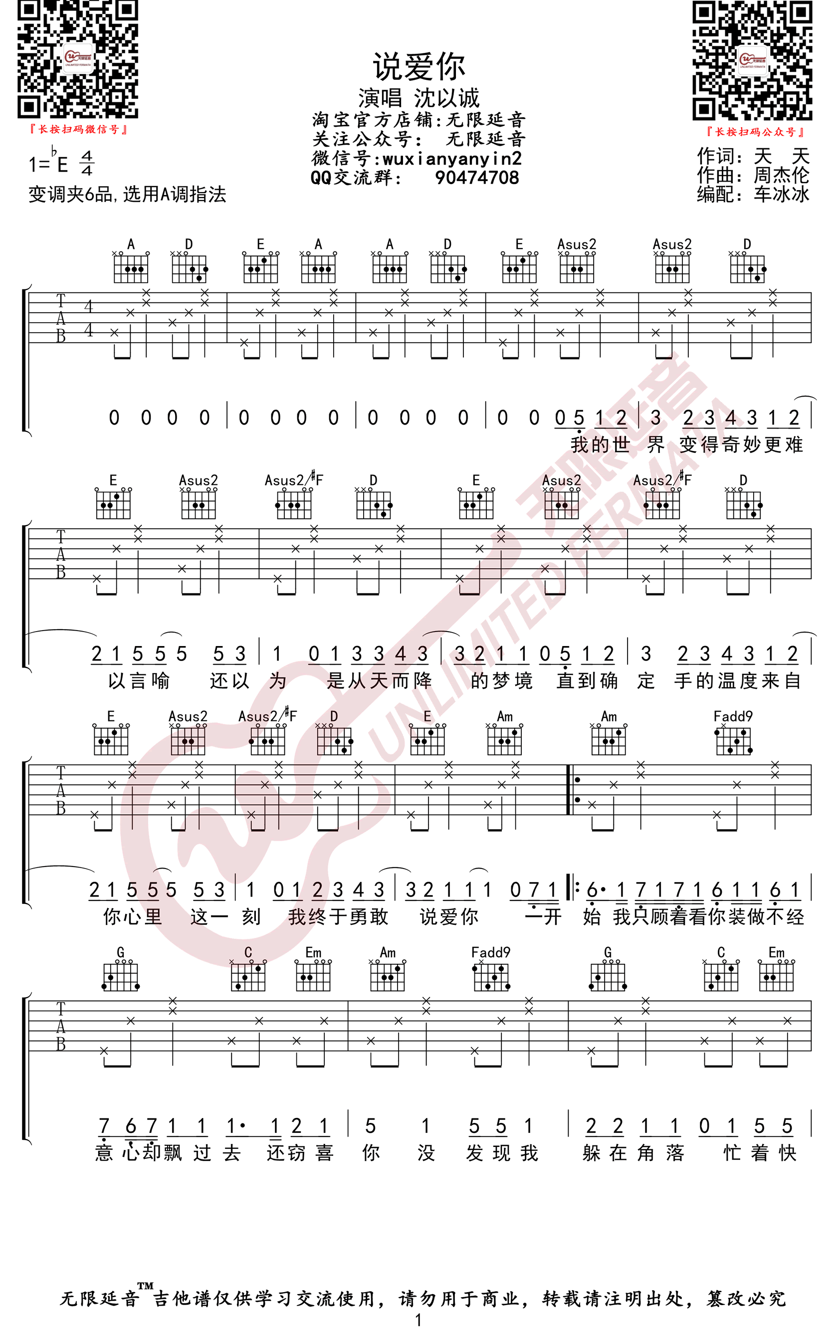 说爱你吉他谱 - 沈以诚 - A调吉他弹唱谱