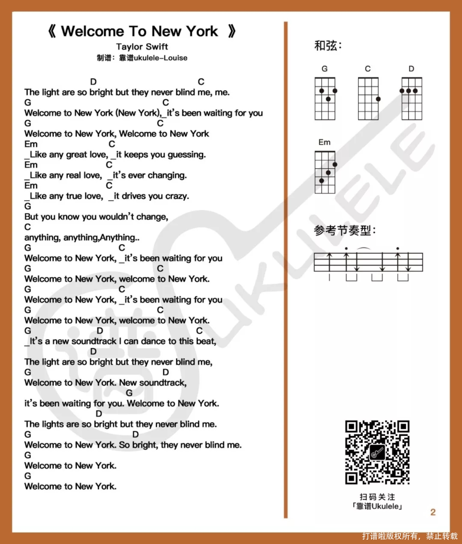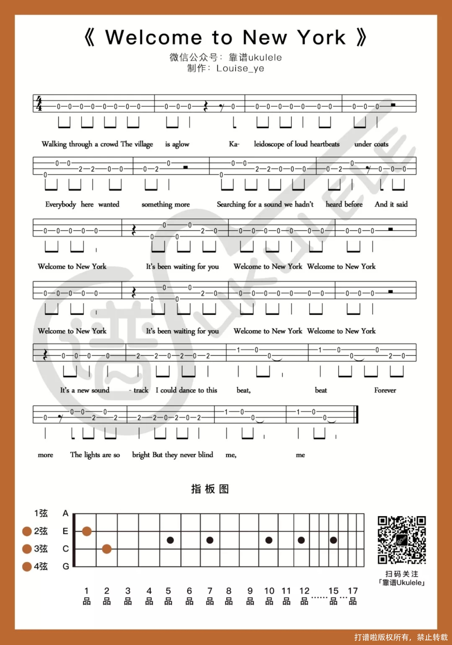 曲谱介绍: 有留言说要Taylor Swift(泰勒·斯威夫特)的歌,无所谓哪首哈哈,我也不知道怎么的就想到这首(可能最近分享的歌都少了些欢快的节奏吧!),然后就有这个分享了啦~。 真的蛮喜欢Taylor Swift,之前也有分享过一首叫《Back to December》的弹唱谱(←点击歌名查看分享),以后慢慢在分享她其他歌来咯~。   ​Welcome to New York ukulele弹唱谱 难度系数:★ 和弦都是万能和弦,所以很简单也很基本,只要你节奏型控制的好!~ 这首歌用到的节奏型有切音,就是箭头上面有小点,如果切音做的不是太好的话,可以选择不切哈。 节奏型口诀:(下~切上~上切上)或(下~下上~上下上)。 英文歌确实歌词确实不太好排……分了两页,喜欢的记得保存的时候不要漏掉咯~。   ​Welcome to New York ukulele指弹谱 其实选这首歌做谱真的就是一时的想法(当然也是有人留言要Taylor Swift的歌我才这样的哈哈哈~)。做弹唱谱还算是比较顺利的,可是做到单音谱的时候我就尴尬啦……这首歌好像很不适合做单音谱……感觉没有弹唱来的好……可是开了头了,就只好硬着头皮做了一小段……后面是真的就没有往下做了…… 就如果有喜欢的童鞋就看看吧,确实是非常简单的一段了!!! 难度系数:☆ 真的,你看指板图就知道,这个移调已经移到了不能再简单了。不算空弦音,只需要按一品二弦、二品三弦……(当然只因为仅分享了第一段的部分……后面真的做不下去,放弃哈哈哈哈哈哈)。 鼓励有喜欢这首歌的童鞋们自主自助试试看补充完整谱子呀哈哈哈。