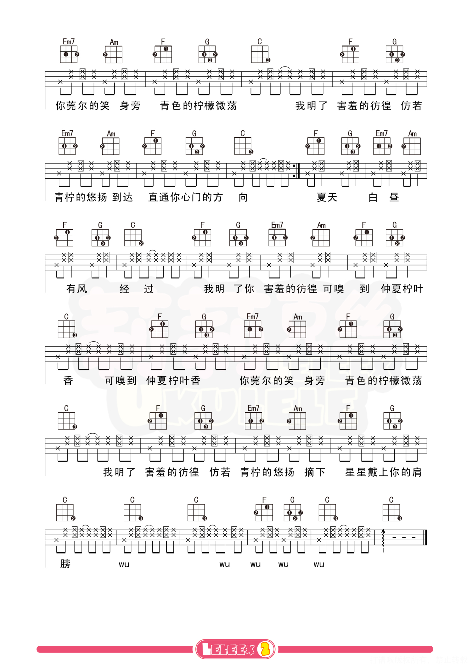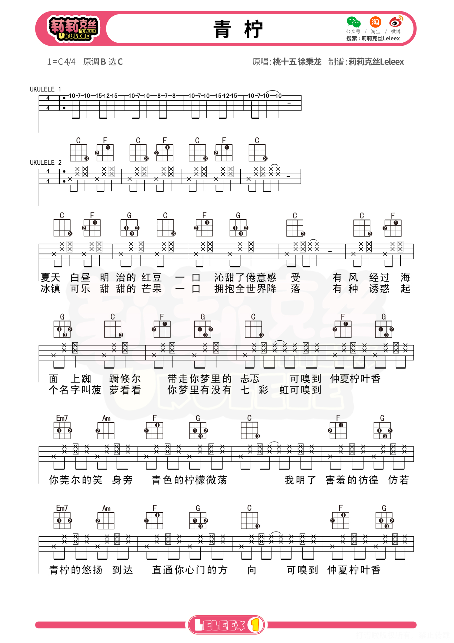 曲谱介绍: 《青柠》尤克里里谱-桃十五 徐秉龙 更多尤克里里曲谱/教学  关注@莉莉克丝Leleex