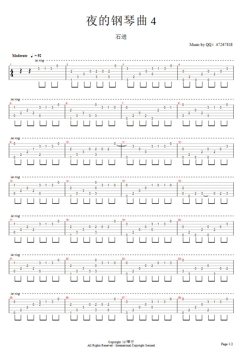 曲谱介绍: 夜的钢琴曲四吉他谱,指弹独奏曲谱,图片谱格式,夜的钢琴曲4吉他独奏谱,根据石进的音乐作品改编。喜欢石进的夜的钢琴曲四,不是因为这首曲旋律有多美,而是因为,这首曲的旋律流淌着的回忆,值得我回味,思索。