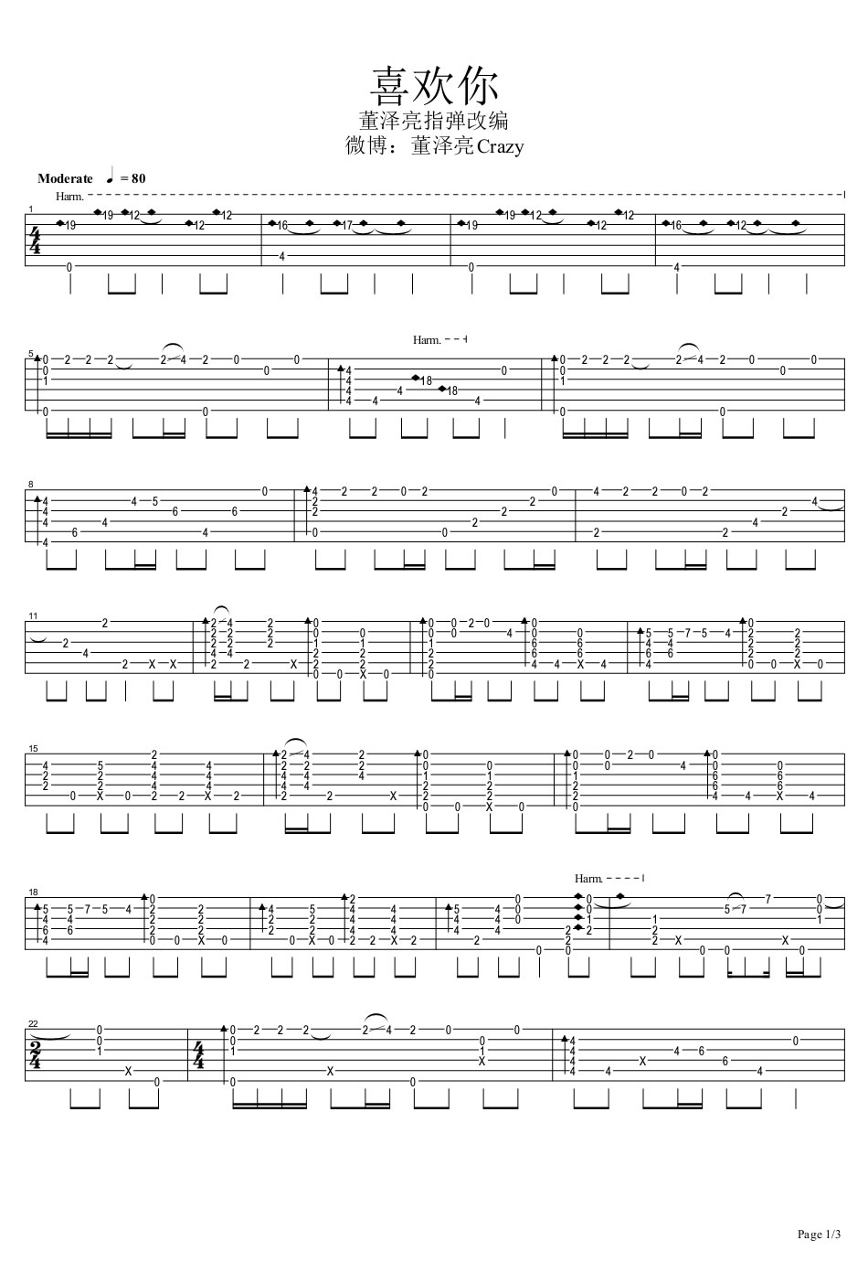 曲谱介绍: Beyond《喜欢你》指弹吉他谱,图片谱高清版,董泽亮指弹吉他改编,喜欢你吉他独奏谱,一首老歌一段熟悉的旋律,再适当的时候缓缓响起沁人心脾,勾起曾经的人与曾经的事,Beyond(喜欢你)琴谱网曲谱推荐收藏。