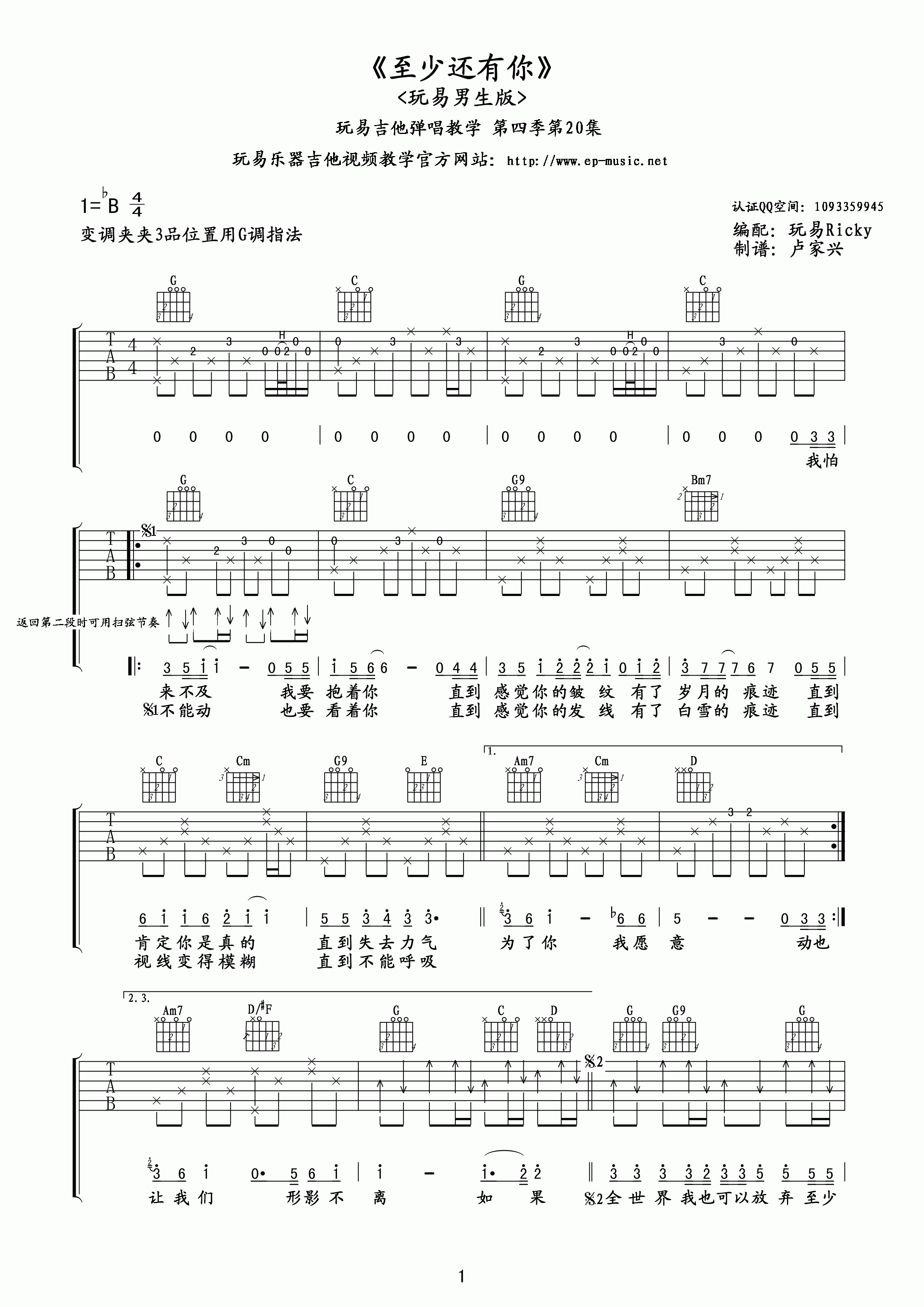 曲谱介绍: 至少还有你吉他谱,林忆莲演唱经典老歌,来自玩易卢老师编配六线谱,男生弹唱版,整体的演奏难度适中但是很有味道。主歌部分在第二遍重复的时候可以用扫弦的伴奏型,详细的细节大家可以查看谱子上的说明。林忆莲《至少还有你》,如果全世界我也可以放弃,至少还有你,值得我去珍惜。林忆莲深情的演唱让人陶醉,听到它就会想起生命中的那个人,一起走过的日子,留下的许多甜美的回忆。
