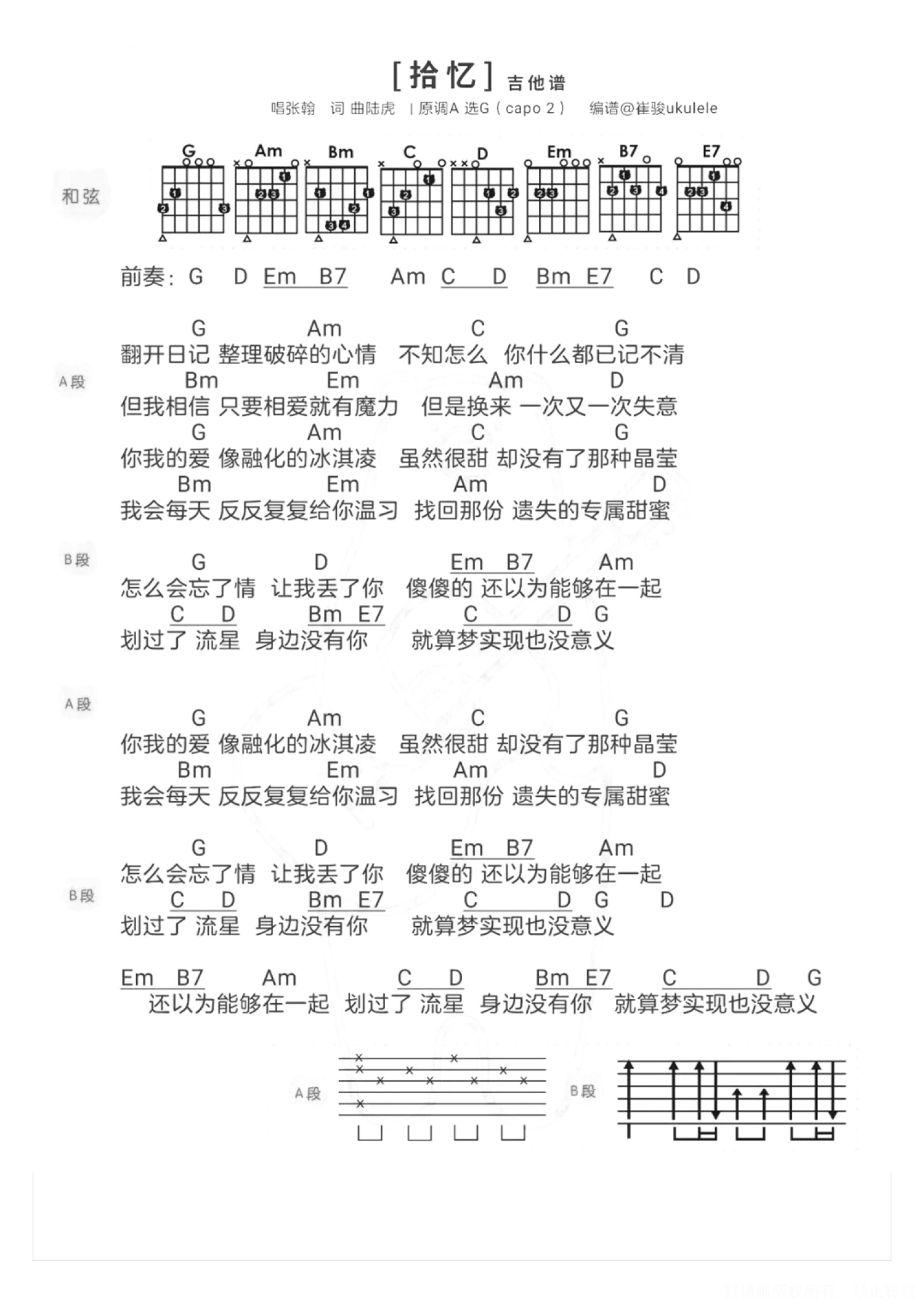 曲谱介绍: 拾忆 弹唱教学|@崔骏ukulele   拾忆ukulele弹唱谱   拾忆吉他谱