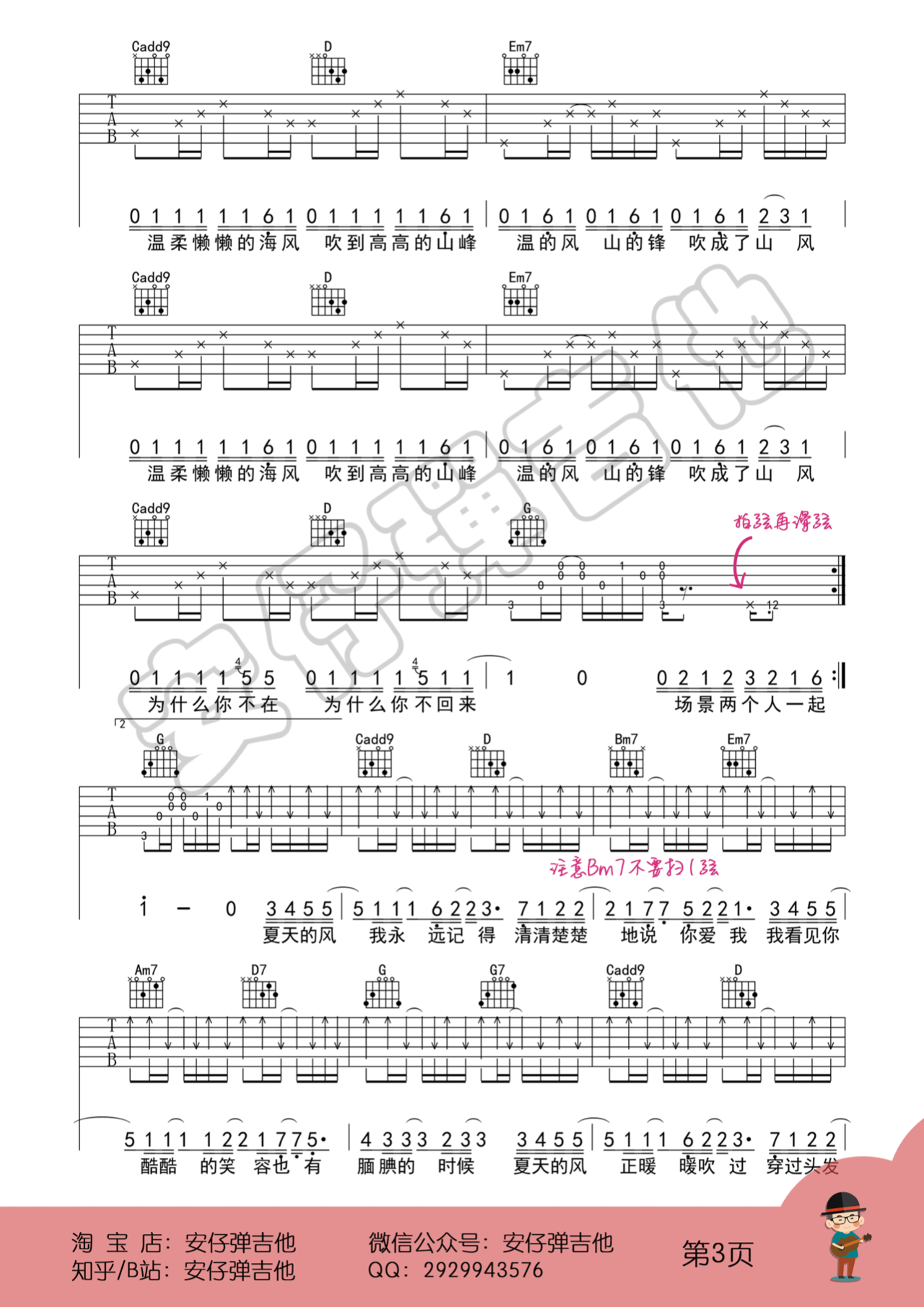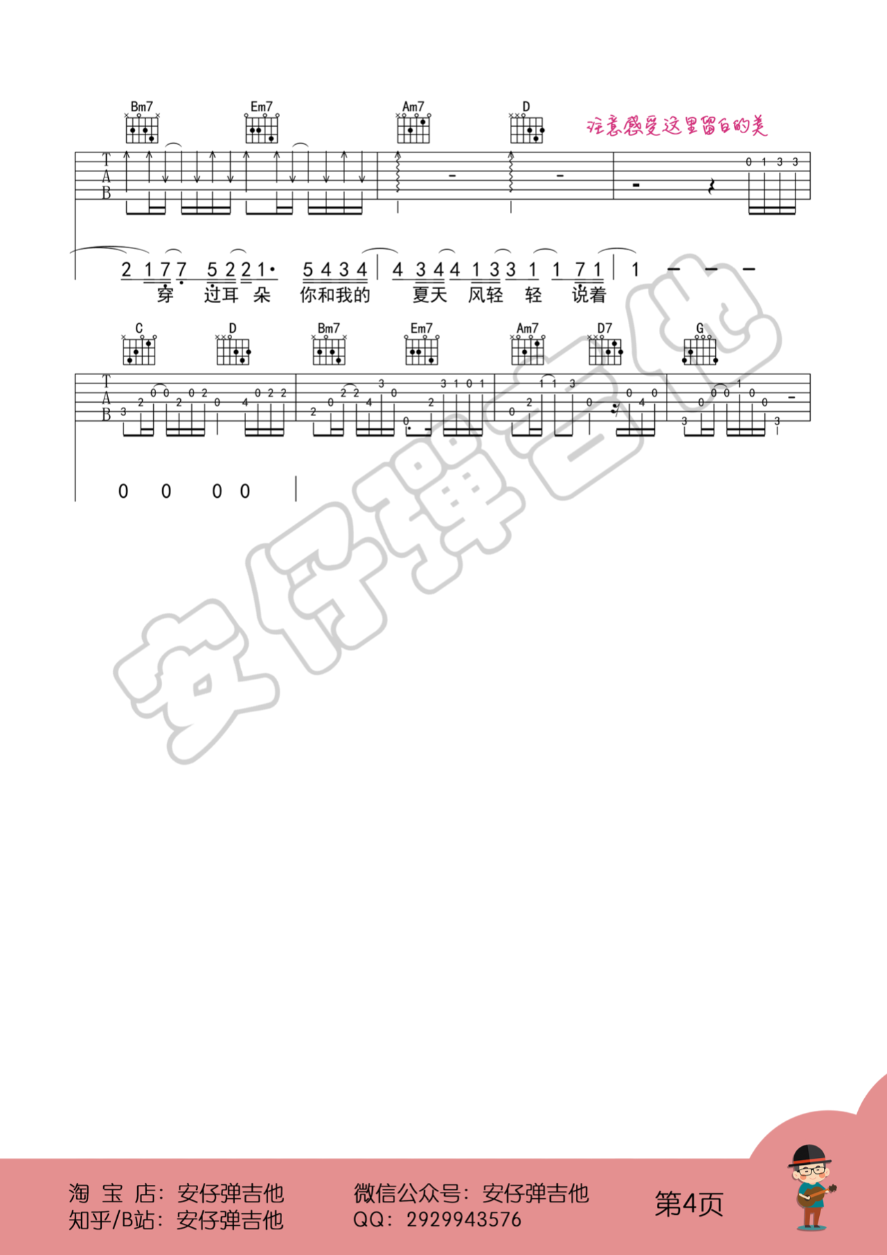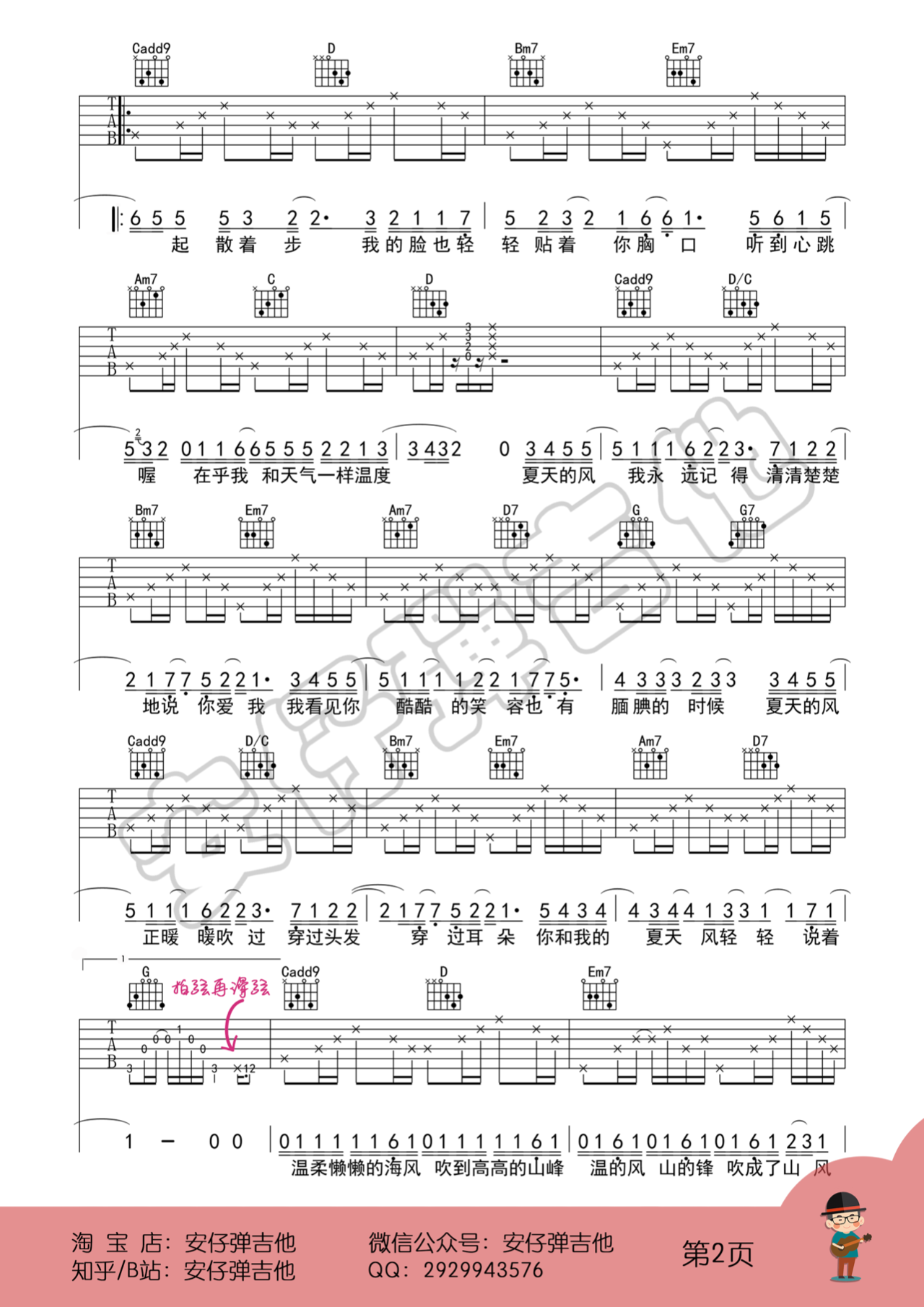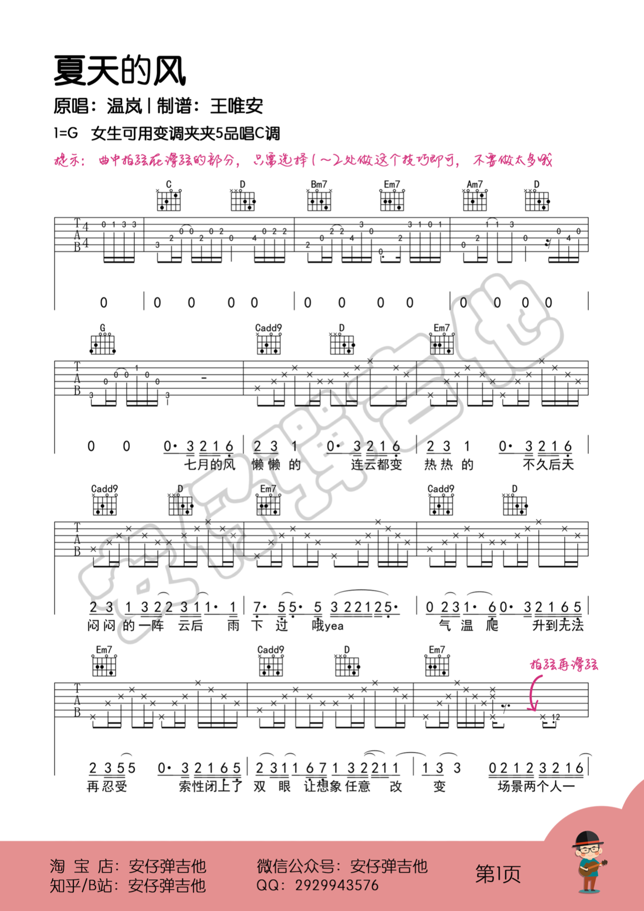 曲谱介绍: 夏天的风吉他谱,G调指法版吉他弹唱谱,来自安仔弹吉他编配,男生调,女生弹唱可以变调夹夹第五品。这首歌的前奏部分和声进行4536251,进入到主歌部分,456做了4遍,非常整齐的做法,副歌又回到4536251,副歌在251之后用一个1级属和弦做过度,旋律让人过耳不忘!喜欢这首歌的朋友,这里还有指弹版哦:夏天的风吉他谱_温岚_指弹独奏吉他谱。