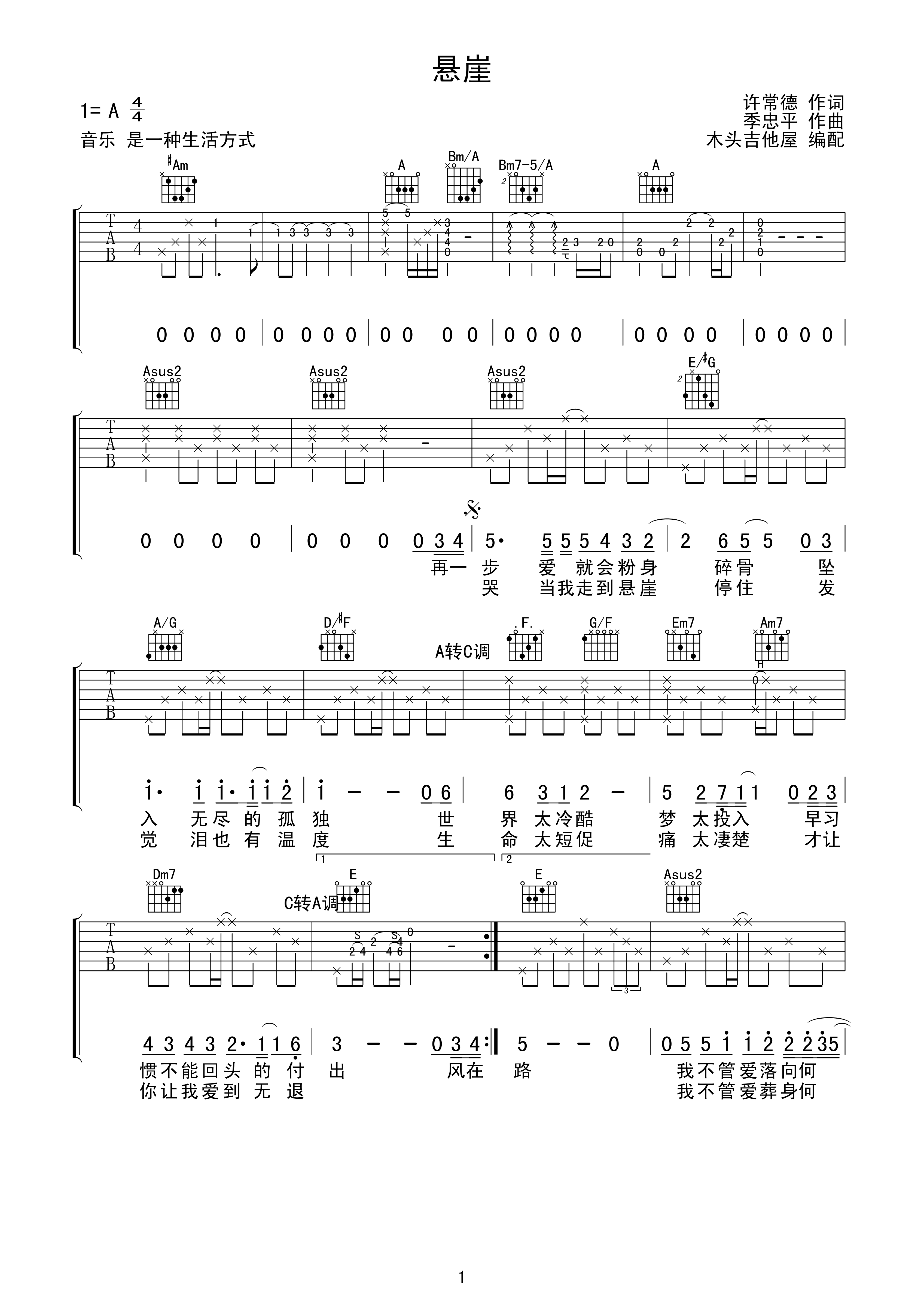 曲谱介绍: 悬崖吉他谱,来自木头吉他屋编配吉他弹唱谱,高清原调指法A调,中间有段转C调再转A调,原调D转F,变调夹夹5品弹唱。歌曲和弦对初学者来说有点难度,还有部分指法也挺复杂,需要分段慢慢练习。副歌部分可以扫弦分解自由发挥。齐秦《悬崖》,齐秦演唱的一首经典情歌,爱到无路可退,依然不言悔的苍凉,不随岁月的流逝而改变真情,那种坚守让人感到痛彻至心的落寞伤怀。