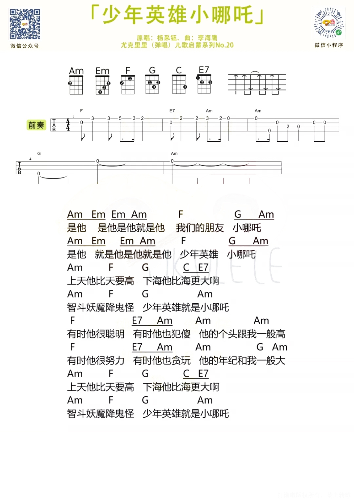 少年英雄小哪吒尤克里里谱 - 杨采钰