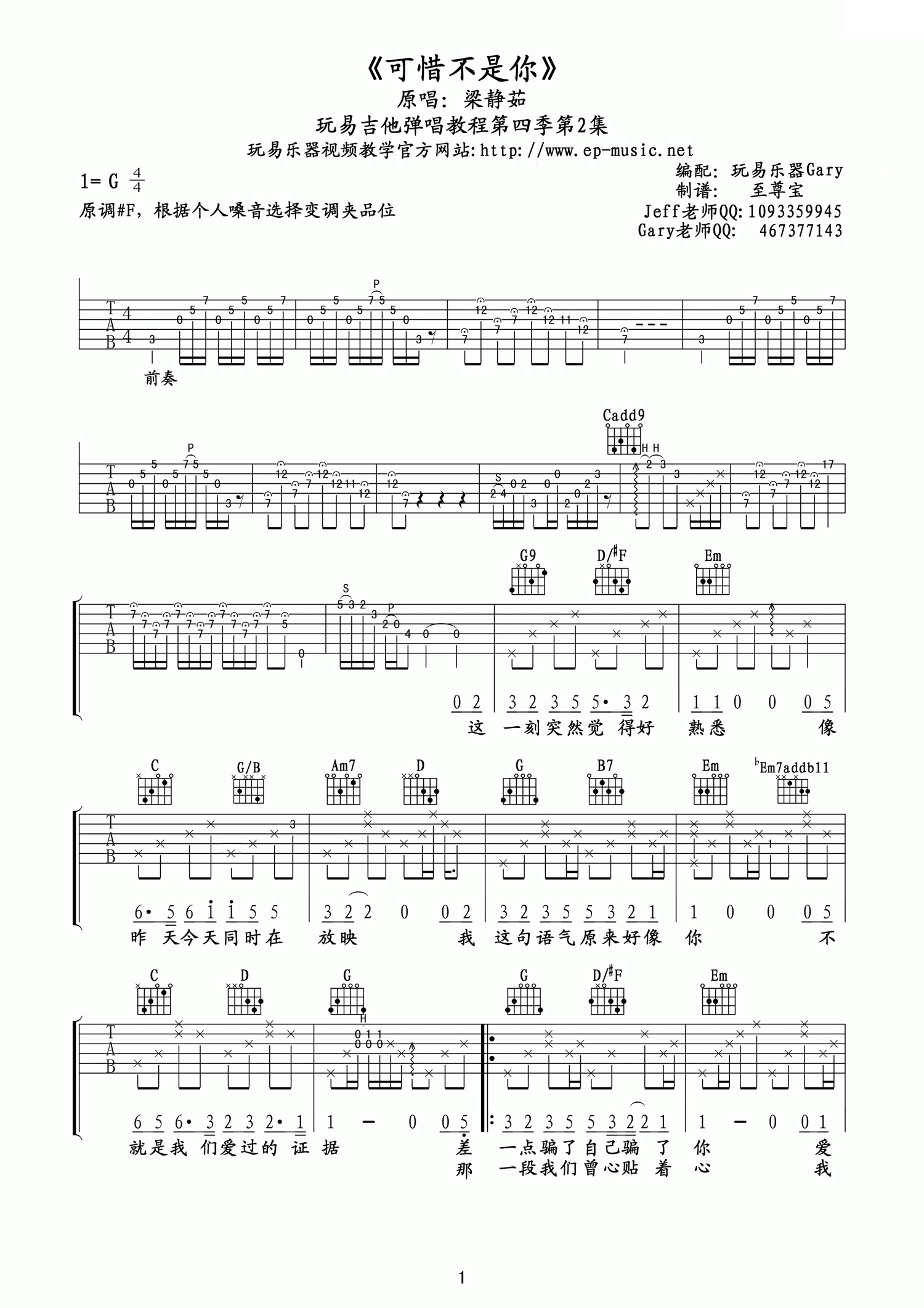 曲谱介绍: 可惜不是你吉他谱,G调指法版吉他六线谱,来自玩易Gary老师编配吉他六线谱,原调F调,大家弹唱可以根据个人的嗓音选择变调夹品位。歌曲的前奏和前奏部分稍微难一点,大家的着重点应该放在右手的指法安排上。可惜不是你,陪我到最后,感谢那时你,牵过我的手,还能感受那温柔。梁静茹《可惜不是你》,唱出了多少人不完美的爱情。那些遇到过“可惜不是你”的人,是可惜,是难过,也可能是多少年后的一笑而过。其他调式的吉他谱参考:其他版本吉他谱参考可惜不是你吉他谱_梁静茹老歌_C调高清版吉他弹唱谱可惜不是你吉他谱_梁静茹_C调初级版弹唱六线谱