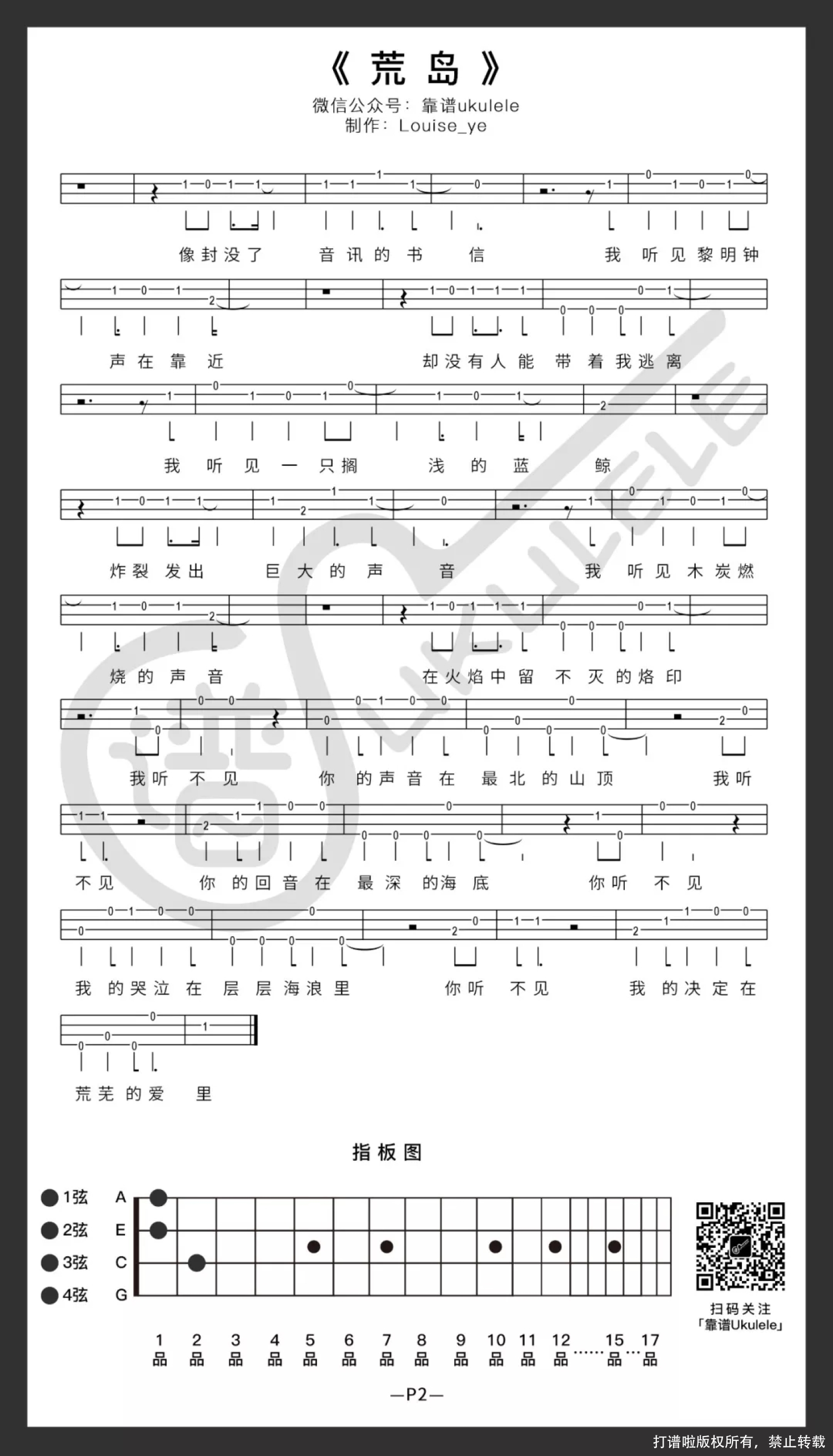 曲谱介绍: 怎么说呢?其实谢春花给我的感觉应该算是小众民谣?虽然她小有名气,也可能很多人不一定知道她,特别不怎么听民谣的朋友,对她肯定是陌生的,但是相信听过之后都会蛮喜欢,所以推荐听听她的歌~(虽然我听民谣也不算太多哈哈哈,但是偶尔还是会听!~)。   荒岛尤克里里弹唱谱 难度系数:★☆ 旋律简单,一共4个和弦。稍有难度的是Bm和弦,不太招人喜欢的大横按。 节奏型基本上一个和弦一组完整的,有下划线的部分就对半分啦~,不久前有个好学的弟弟问我,怎么看几拍子的?因为弹唱谱一般不会有4/4这样的显示,其实很简单,看节奏型,如果类似U型符号的就是代表1拍,这首节奏型一共有4个,那聪明的你们一定知道答案了,对吧?~   荒岛尤克里里指弹谱 单音版 也不知道为什么越看歌词越觉得有画面感……那种感觉有时候很朦胧,却又好像似曾相识…… 有没有一条路可以通向你的心?有没有喜欢过一个空心玻璃瓶?那一种感觉真的像极了处在荒岛时候的感觉吧……有些不知所措?有些迷茫?有些无助?有些无可奈何……?想找寻出路却因不舍而把自己困在了爱的荒岛上……等着没有回音的救援…… 难度系数:★ 这首简单啦~感觉不用什么呢,除了空弦音,需要用到的就只有一品的一弦、二弦;二品的三弦。 谱子一共两页哟!保存的时候记得别落下。