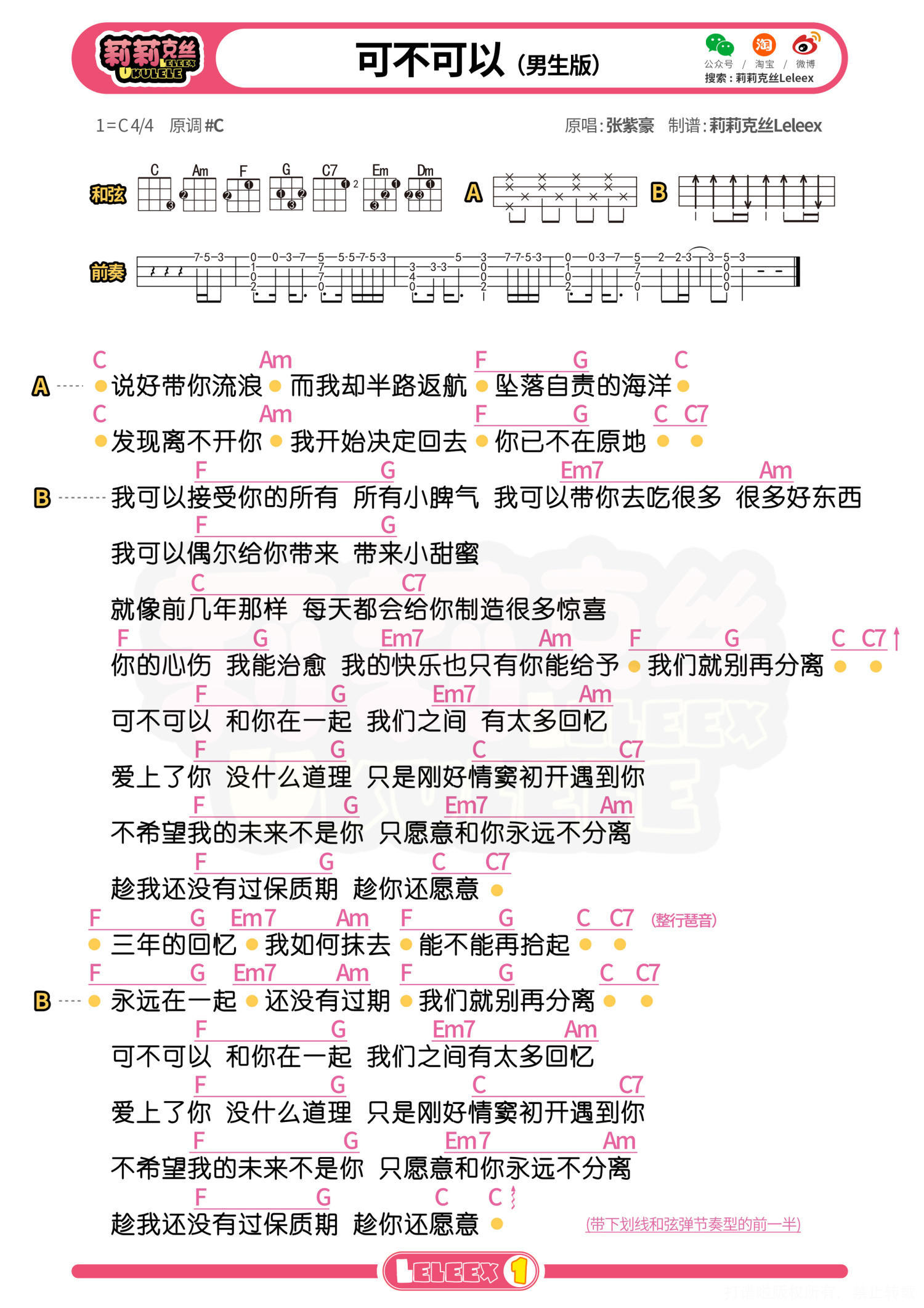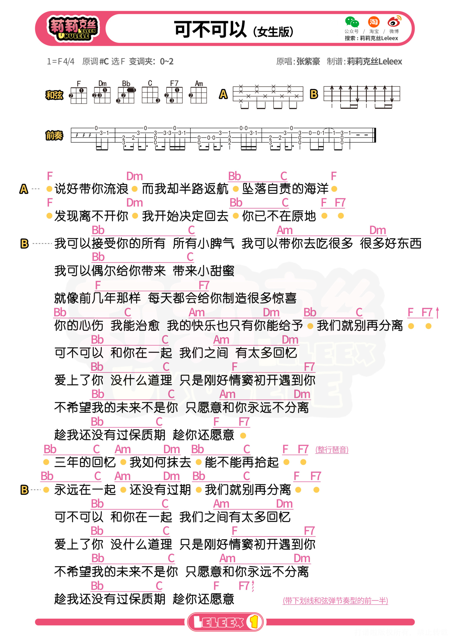 曲谱介绍: 《可不可以》尤克里里谱 男生版(女生版在下方) 女生版