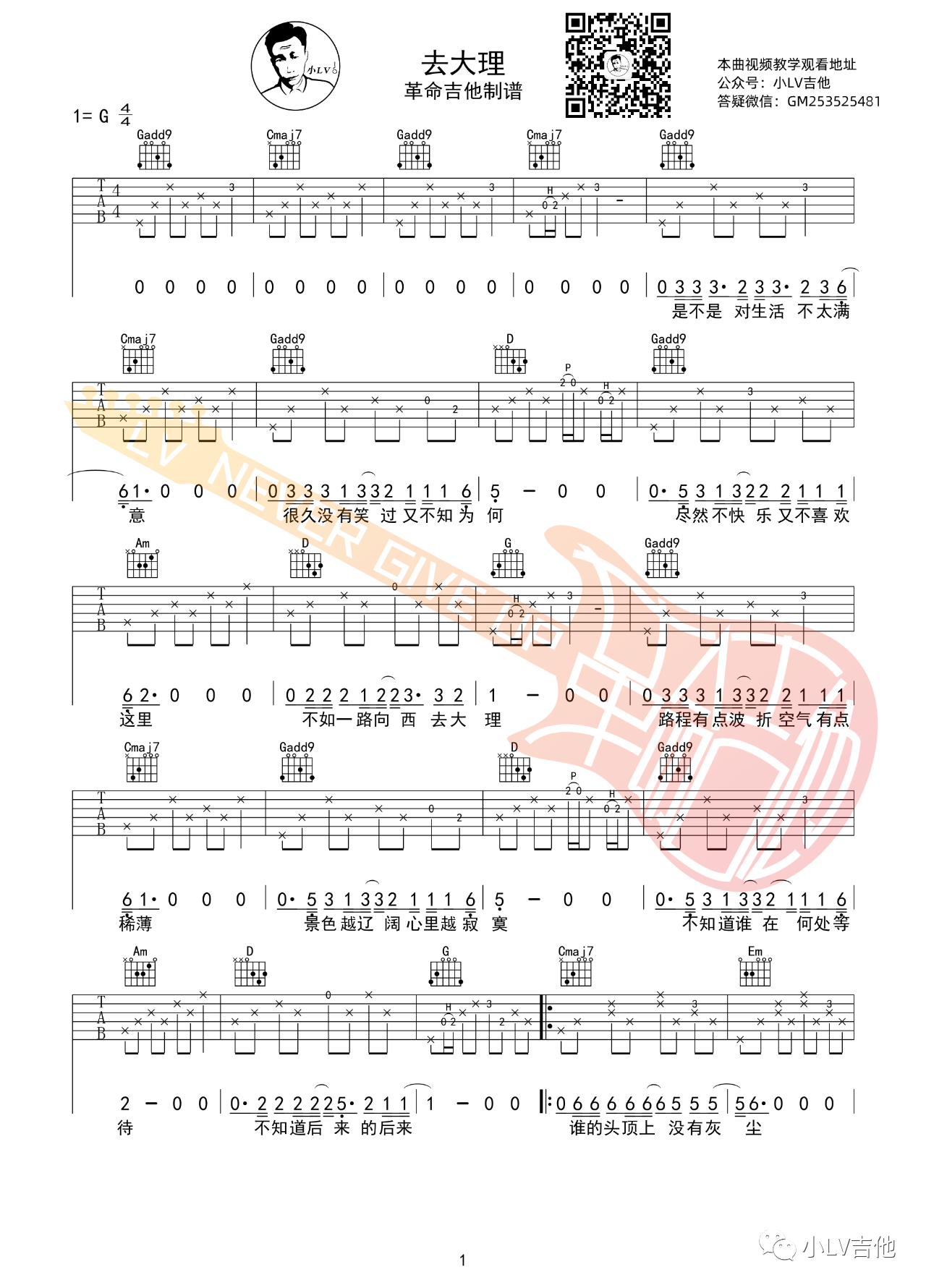 曲谱介绍: 郝云《去大理》,多少爱恋敌不过时间,多少温情败给了现实,既然不快乐,又不喜欢这里,不如去大理。捡起被时间碾碎的勇气,让双脚沾满清香的泥。去大理吉他弹唱六线谱,来自小LV老师编配弹唱谱,适合新手的弹唱版,附教学讲解视频。