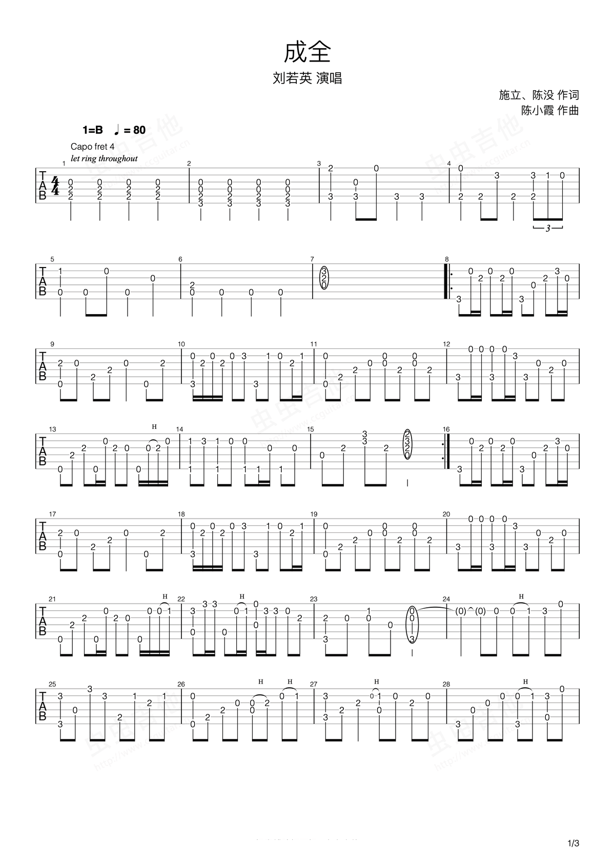 曲谱介绍: 刘若英《成全》吉他独奏谱原版,共有4张高清图谱。