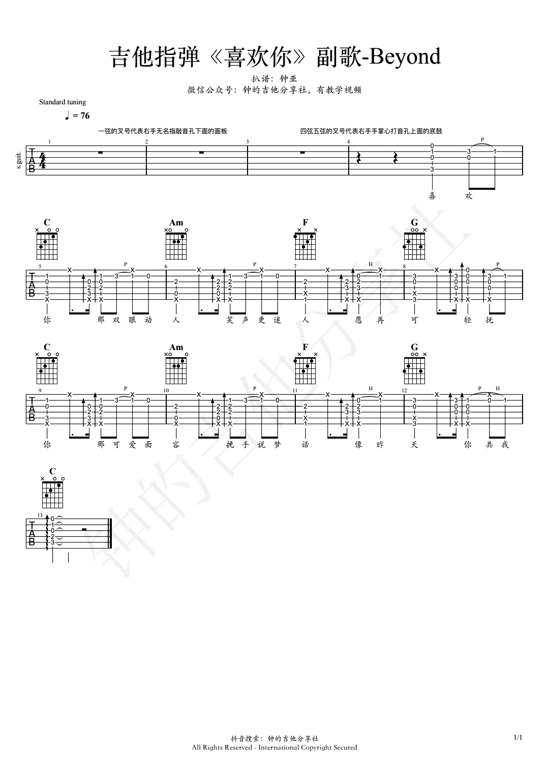 曲谱介绍: 喜欢你吉他指弹谱,Beyond的一首经典粤语歌曲改编,喜欢这首歌的副歌,Beyond和邓紫棋,唱的调性不一样,一个是C调,一个是F调。《喜欢你》吉他独奏谱,副歌部分为C调和弦指法编配,C调各级和弦:C-Dm-Em-F-G-Am-Bdim。和弦大致走向:C-Am-F-G即1-6-4-5。琴谱网更新上传。副歌教学曲谱,目前就编了副歌部分,完整版以后再说,随谱附上《喜欢你》吉他指弹教学视频,大家加油练。