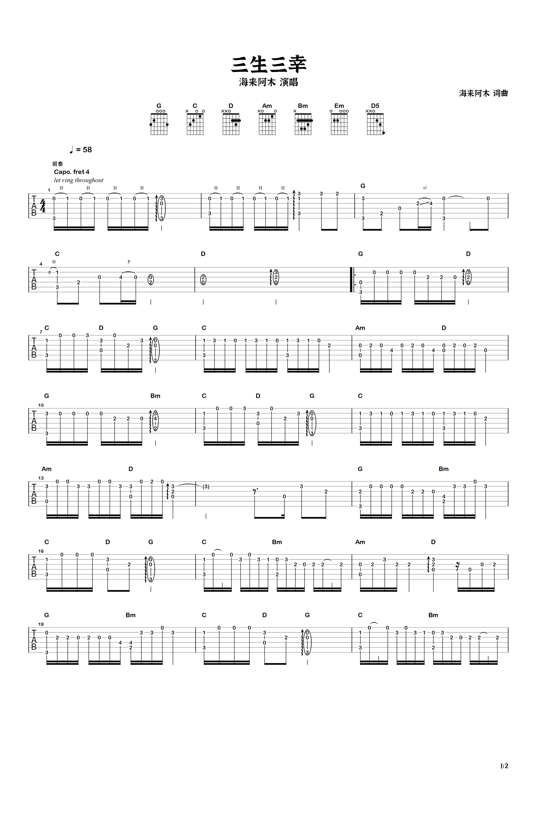 曲谱介绍: 三生三幸指弹吉他谱,海来阿木演唱的一首热门网络歌曲改编,花开是你叶落是你,白首不相离!《三生三幸》吉他独奏谱,选用G调指法,Capo夹四品,完整版共三张高清图片谱例,琴谱网更新上传。歌曲用近乎直白的文字,描写了人这一生经历的酸甜与苦辣,无奈与迷茫。歌声中,有着难以抗拒的悲伤与失落的情感,不知戳中了多少人的内心。