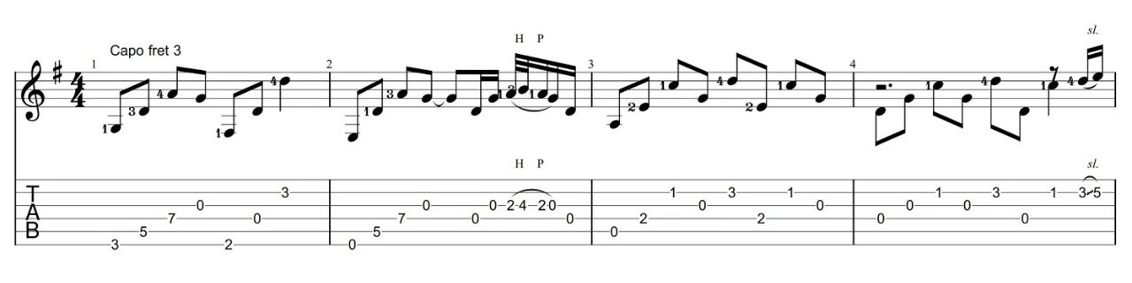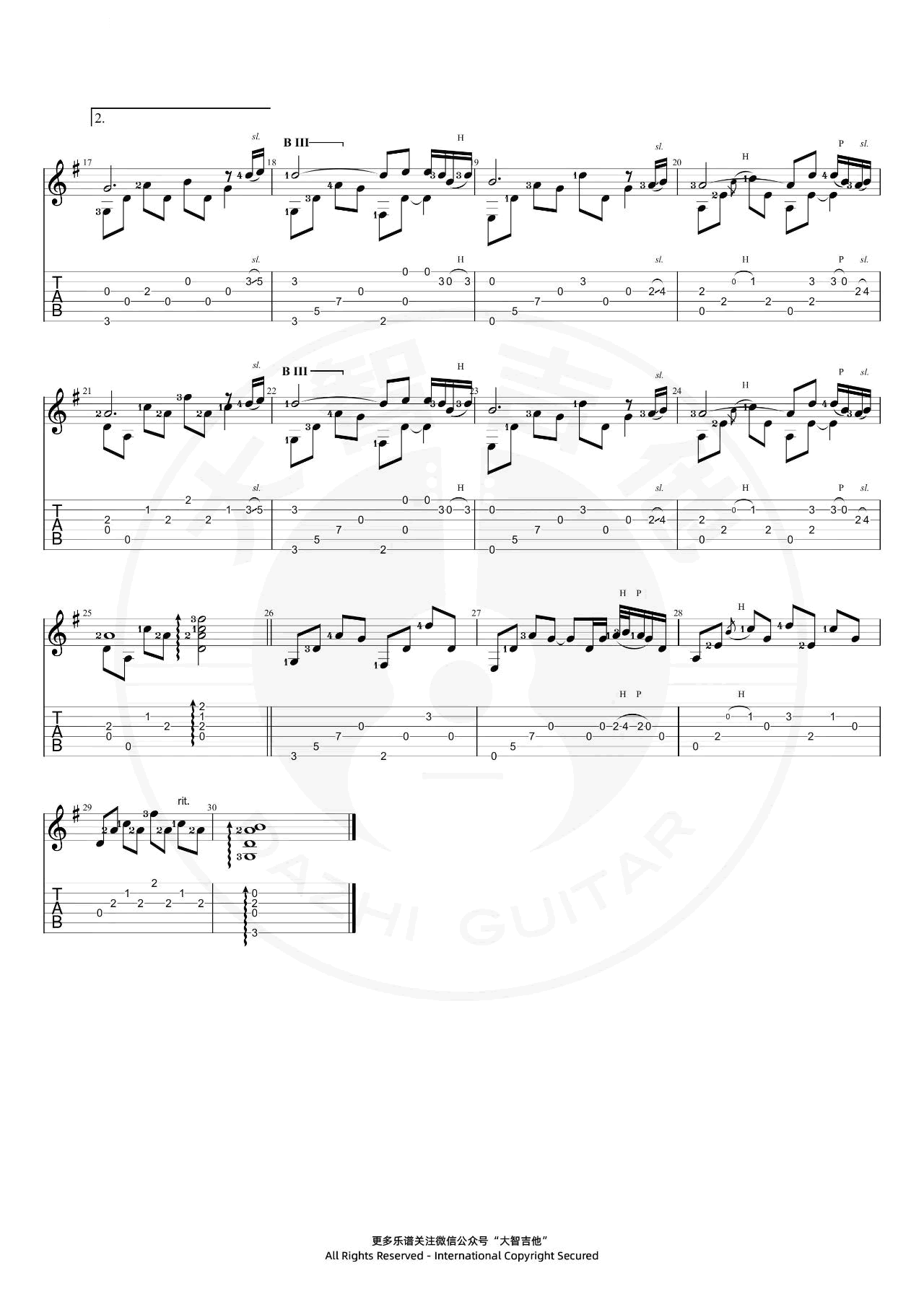 曲谱介绍: 向云端指弹吉他谱,改编自黄绮珊小霞/海洋bo演唱的热门歌曲。附上配套吉他独奏保姆式吉他教程,琴友们跟随老师的讲解视频学习。《向云端》吉他独奏谱,用G调指法演奏,变调夹夹至吉他第三品,实际音高为♭B调。六线谱共两张图片,感谢大智吉他出品,琴谱网上传。这首曲子如同一剂心灵疗愈剂。让我们沉浸于优美旋律和歌词所创造的意境中,感受那思绪的漫游、向往的憧憬、希望的萌发与宁静之感。你聆听这曲时,放下焦虑执念的负担,去凝望流云,观赏夕阳,微风中轻闭双眼,感受这美丽世界,感受不自己的内心力量…… 乐谱中第二小节的第四拍出现了三十二分音符,一个三十二分音符是1/8拍,就是把一拍平均分为八份,每一个三十二分音符占一份。在这里两个三十二分音符加一个十六分音符的时值类似于前十六后八分的时值,只不过要比前十六后八分的时值快一倍。这里可以演奏的相对自由一些,也可以弹成三十二分音符的三连音。