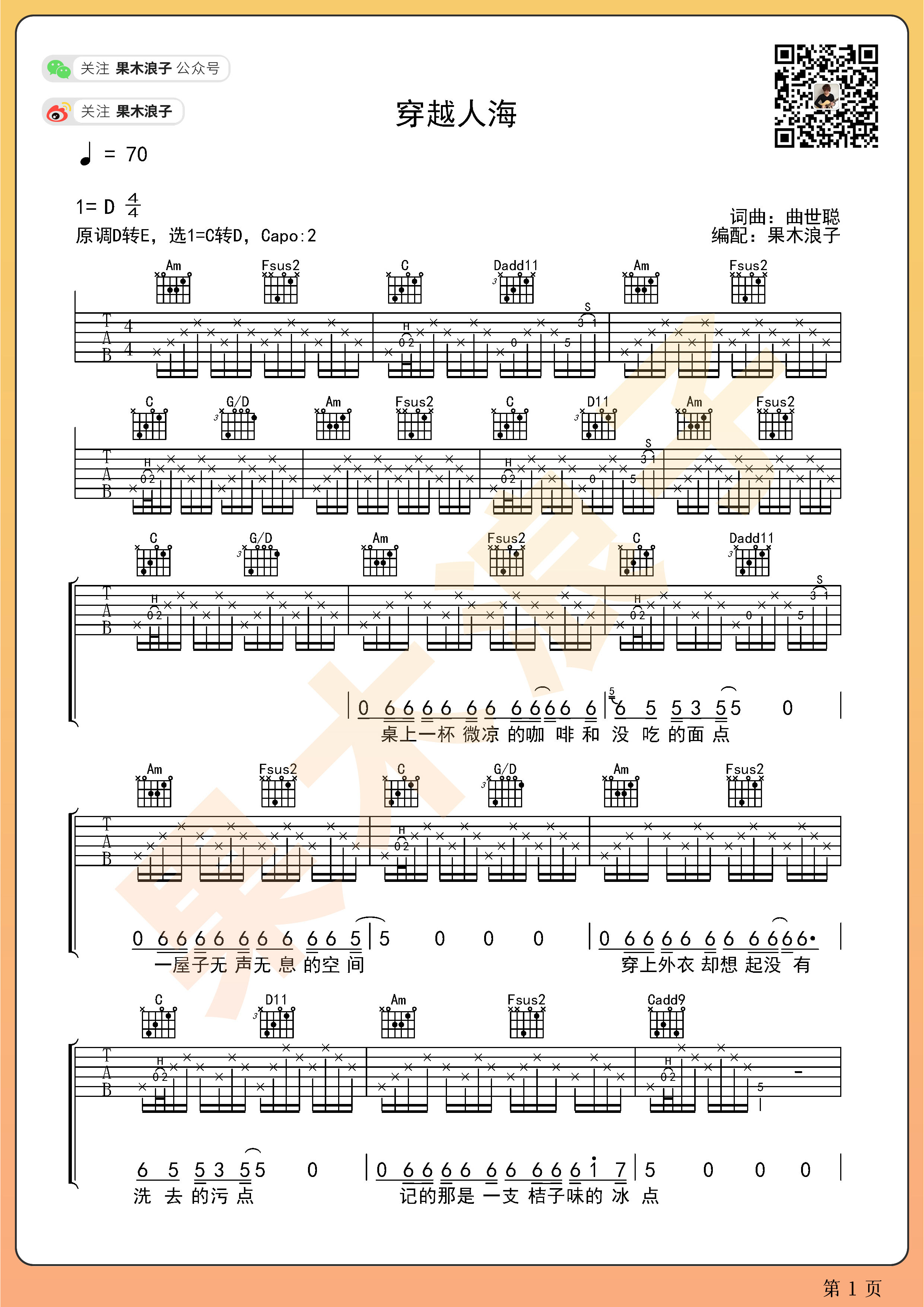 曲谱介绍: 穿越人海吉他谱,张杰演唱歌曲,来自果木浪子编配制谱。歌曲的演奏一共分三部分,分别是C调的分解伴奏,后转D调分解,最后D调扫弦节奏,歌曲的演奏难度★★☆☆☆。 吉他弹唱演示及视频教学 《穿越人海》吉他弹唱教学视频张杰《穿越人海》,他的歌声似乎让人有一种想要落泪的冲动,但随即释然,曾经沧海,唯爱不变。人海茫茫,你却不见踪影;夕阳泛红,你却不在身旁。穿越人海,始终如一,以爱之名,步履不停!