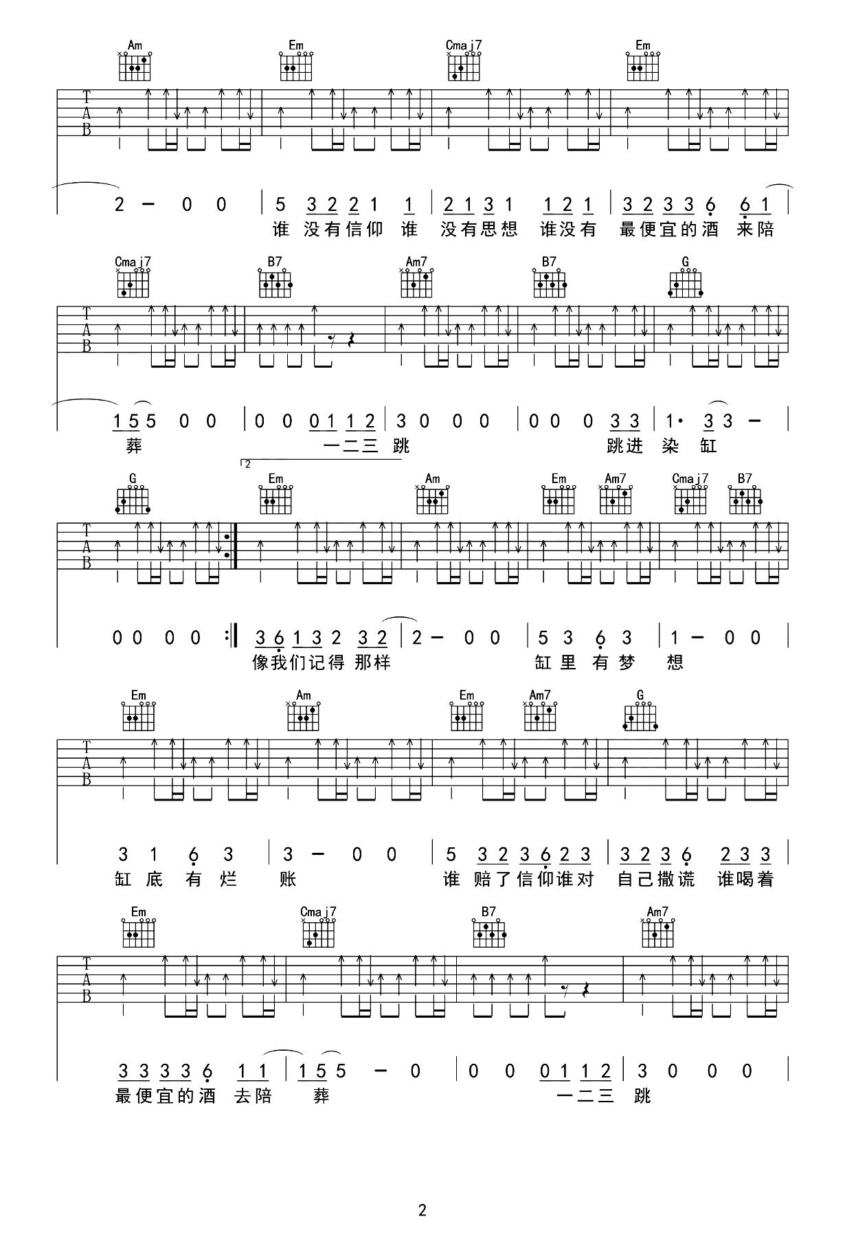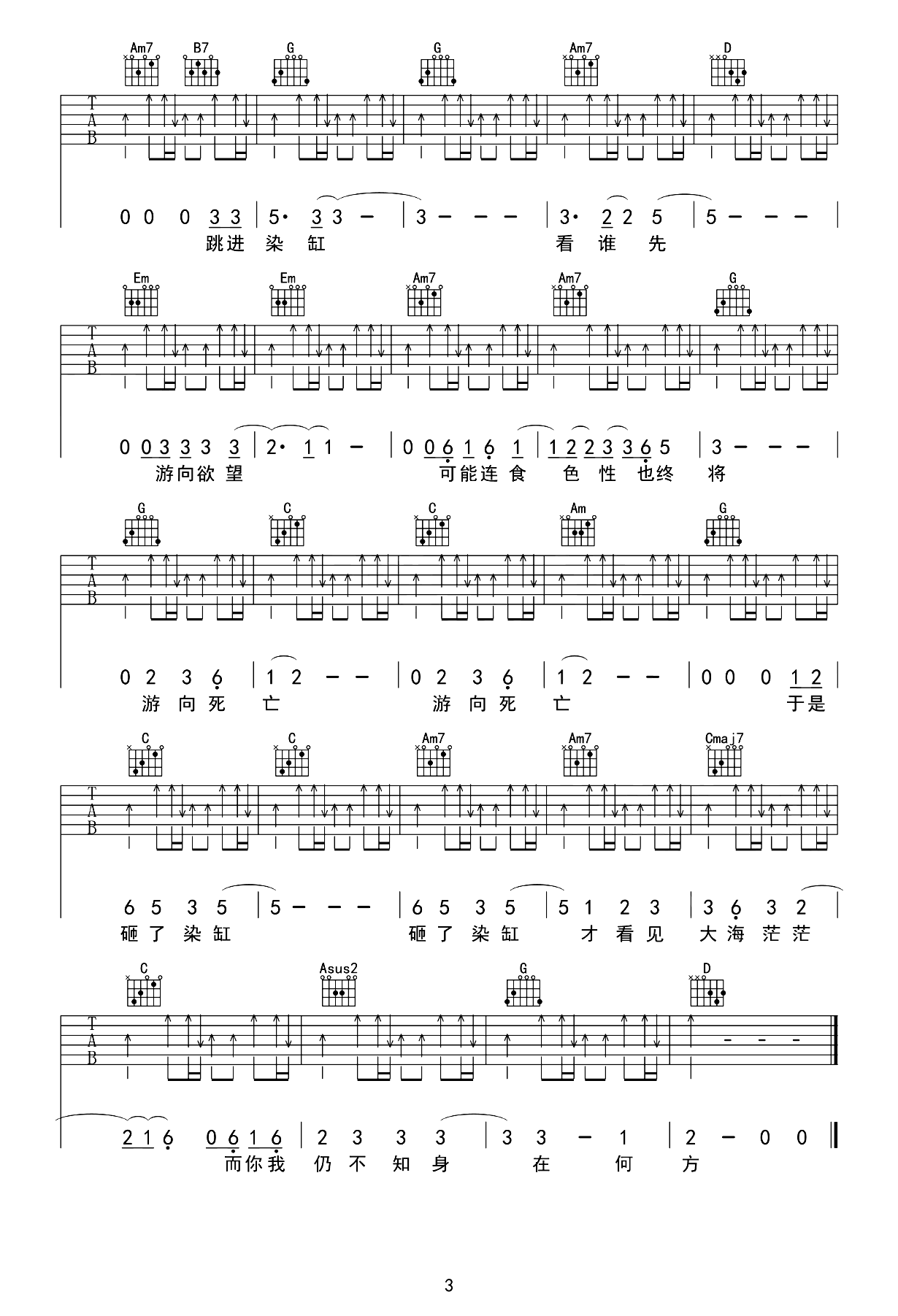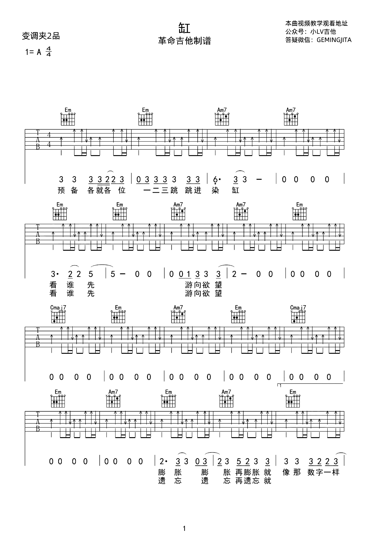 曲谱介绍: 缸吉他谱,草东没有派对演唱,曲谱简单易学。《缸》吉他弹唱谱,原调A,选用G调指法编配,变调夹夹二品,六线谱完整版共三张图片,感谢革命吉他制谱分享,琴谱网更新上传。 我跳进了染缸里,原本的自己已被抛之脑后,化为半成品静候染缸的加工。染缸内斑驳的色彩封存了我的梦想和信仰。在染缸中,我需面对沉淀的铜钱与追寻的欲望,平凡无奇的生命正在逐渐消逝。于是,我选择反抗,将染缸砸碎。