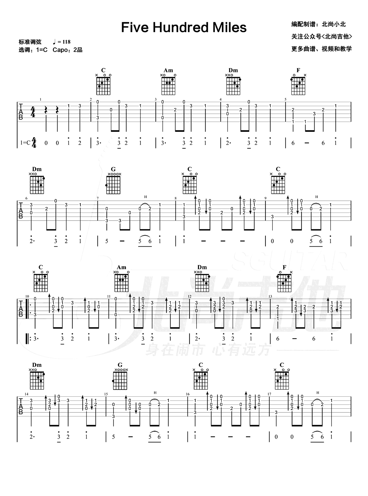 曲谱介绍: 500 miles指弹吉他谱,改编自经典美国乡村歌曲。附上吉他弹奏示范视频,同学们跟随老师的演示练习。《500 miles》吉他独奏谱,采用标准音调弦,C调和弦指法编配,变调夹2品,速度每分钟大约118拍左右,共两张图片六线谱,北尚吉他出品分享,琴谱网上传。 《500 miles》演奏难度为1颗星,带上了和弦指法和简谱,可以练习一个很常用的乡村民谣节奏型,分解+扫弦的复合节奏,非常锻炼右手扫弦之后迅速找弦的能力,适合有1年以上指弹基础的琴友练习。