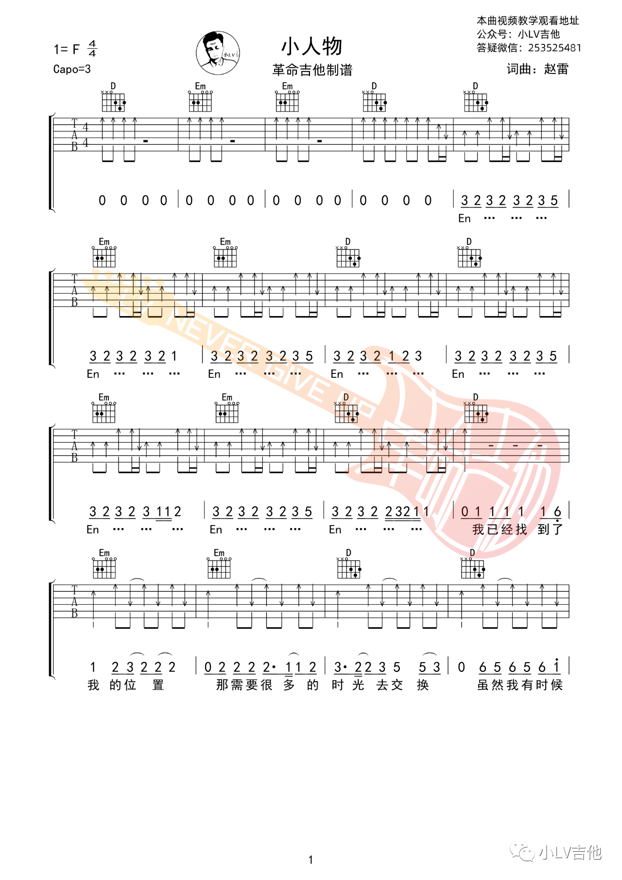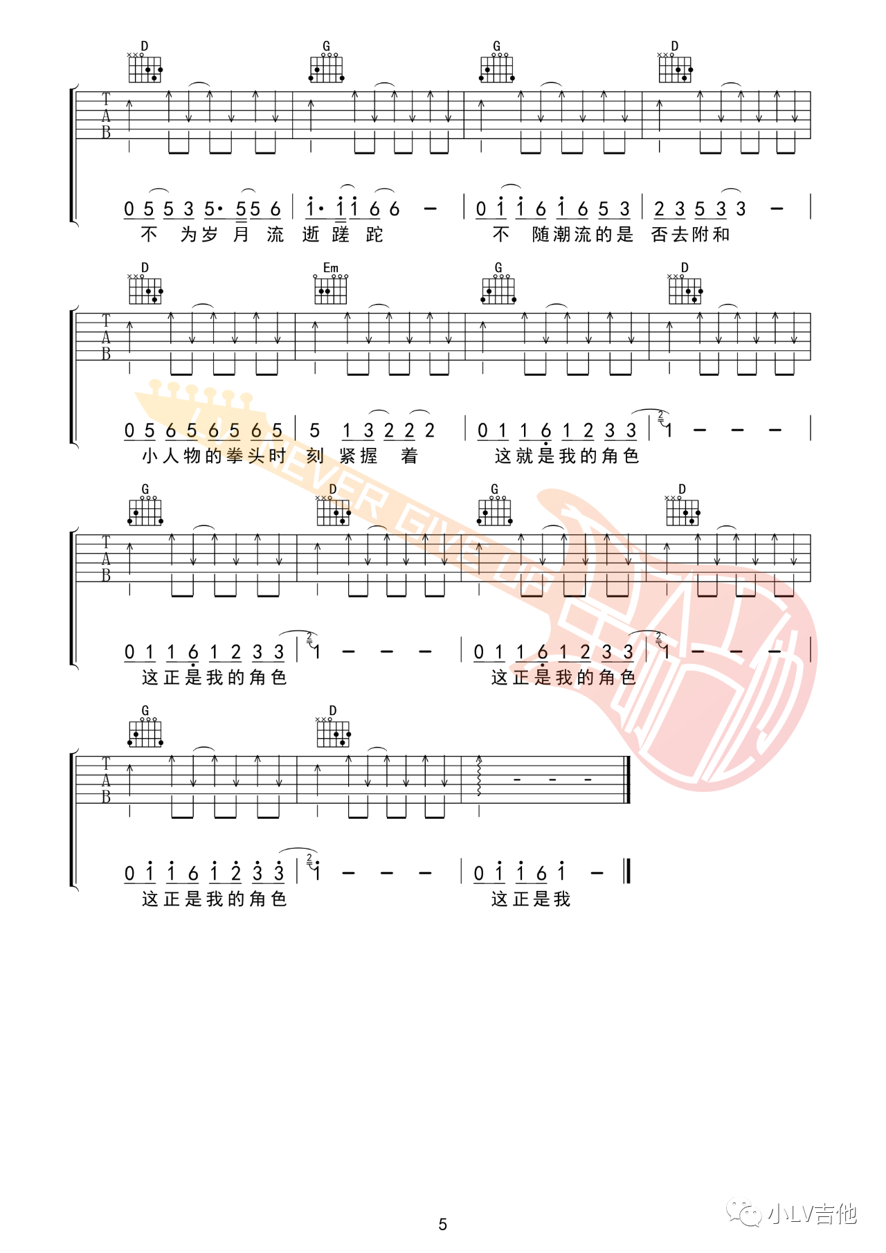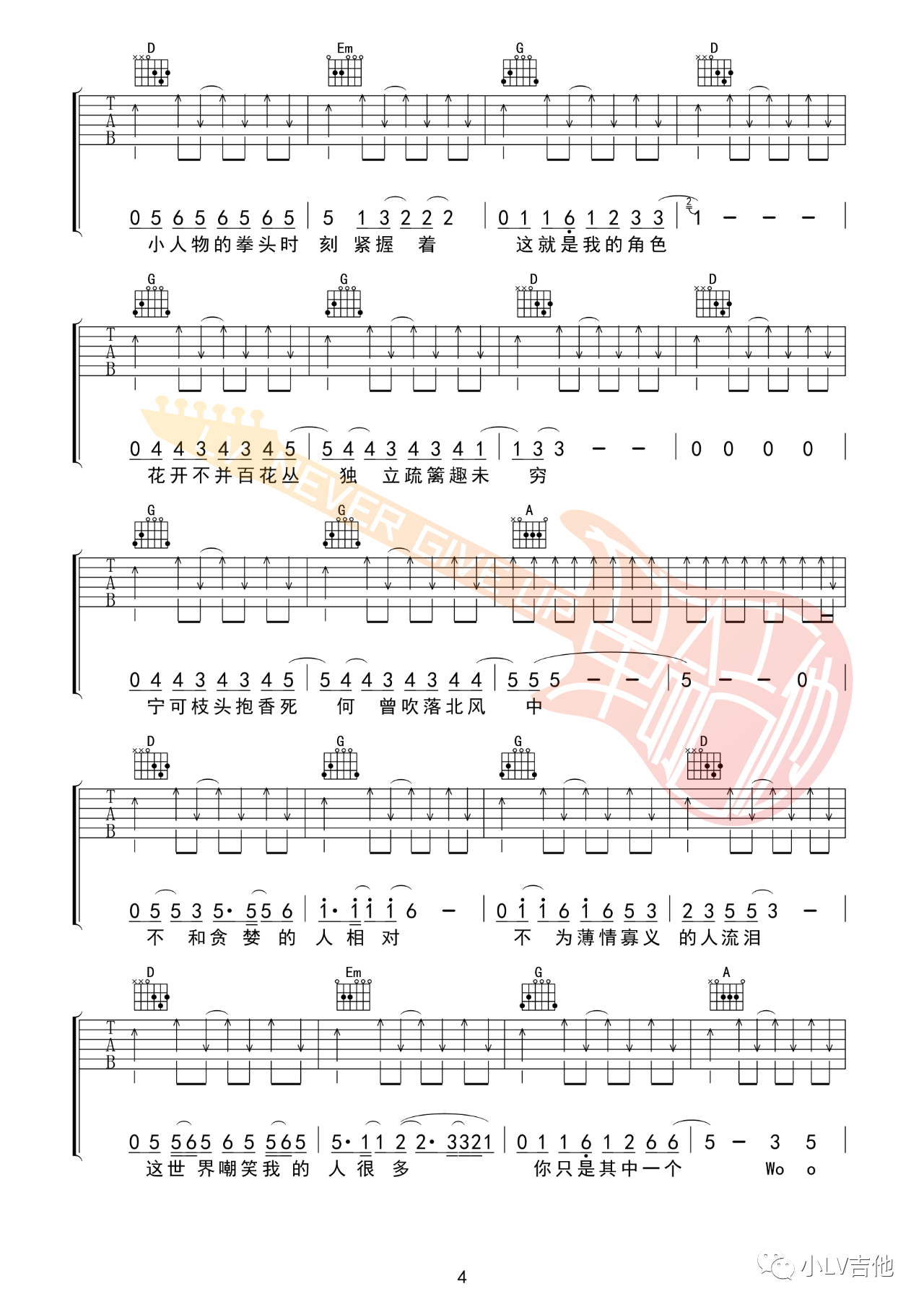 曲谱介绍: 小人物吉他谱,D调版吉他弹唱六线谱,来自革命吉他教室编配分享。这首歌的篇幅较长,整体都是采用扫弦的伴奏型来演奏的,只用到两种扫弦音型,难度较低,附演示和教学讲解。赵雷《小人物》,平凡不是桎梏我们的紧箍咒,它和小人物的精气神儿一样,是我们闯荡世俗的定海神针。这世界嘲笑我的人很多,你只是其中一个。我是小人物,有自己的梦想和执着。