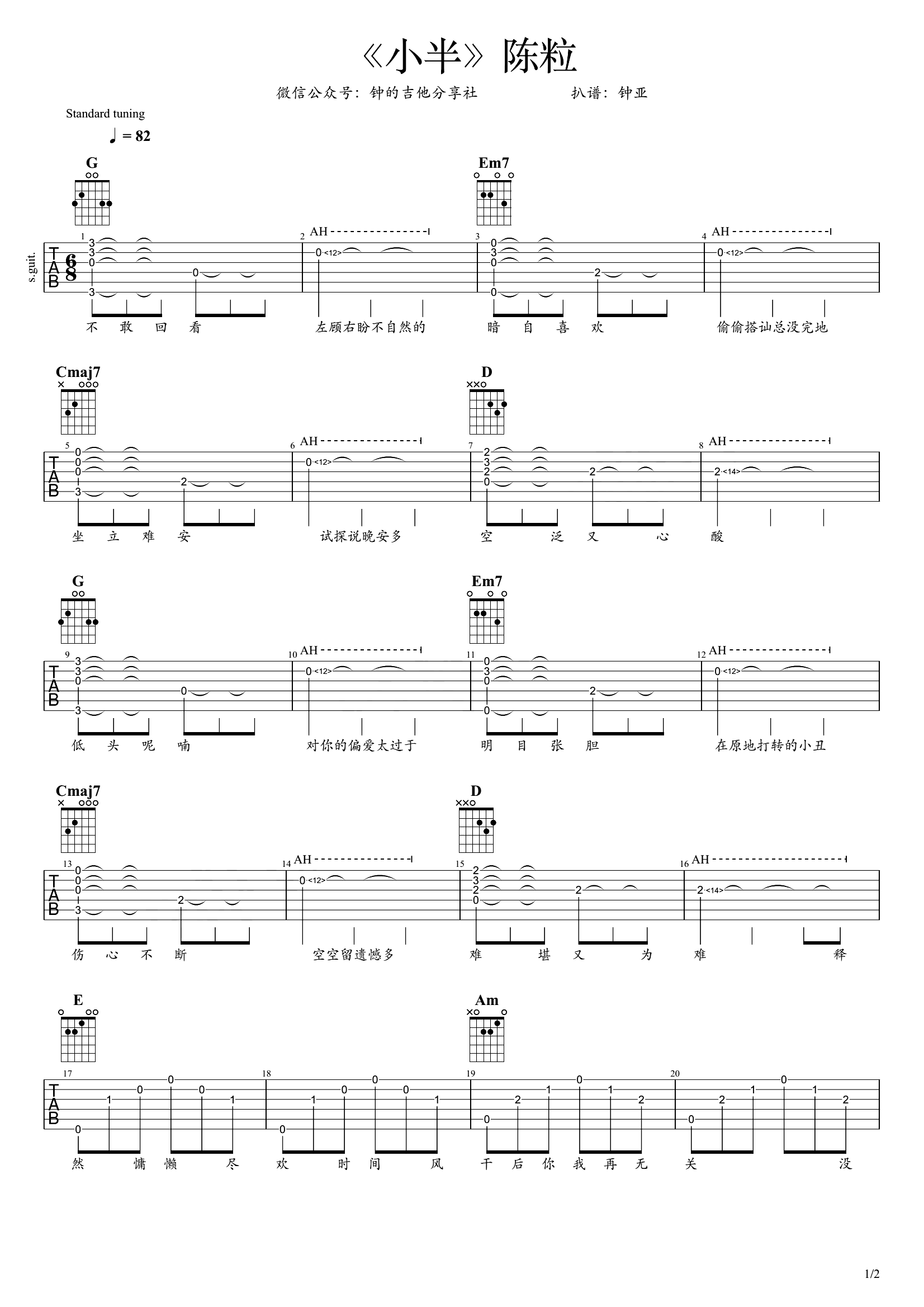 曲谱介绍: 小半吉他谱,陈粒的一首经典代表歌曲,这首情歌纯净细腻,诉说真挚的内心情感,像一泓涓涓细流,抚摸着我们内心深处的柔软。《小半》吉他弹唱谱,歌曲原唱G调,标准调弦,G调和弦指法编配,G调各级和弦:G-Am-Bm-C-D-Em-#Fdim。歌曲大致和弦走向:G-Em-C-D即1-6-4-5。共两张图片六线谱,感谢钟亚编配分享,琴谱网更新上传。 86拍歌曲,吉他的伴奏,前面部分用和弦音+泛音,简单纯粹;中间部分86拍经典右手分解节奏型:632123、532123……副歌部分86拍经典扫弦:下下下 下 下上 下上 。