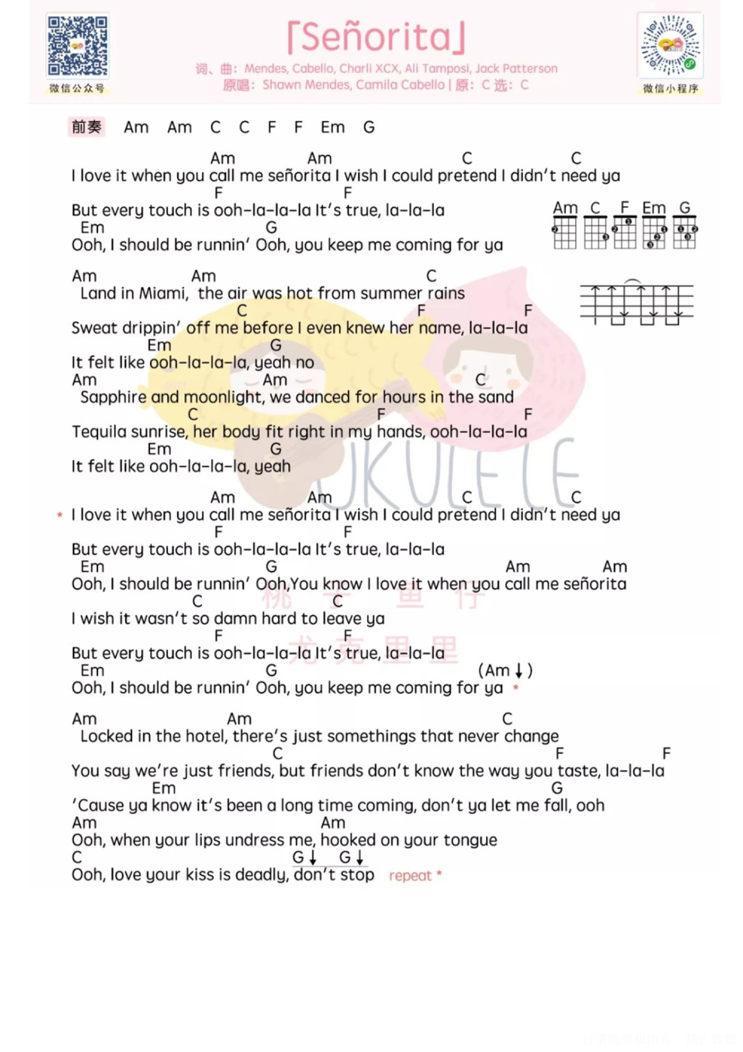 曲谱介绍: 某音真是觅歌的好地方 总是让人刷视频的时候 不经意的发现一首好歌 有些人不希望让这些歌火起来 不想这些好歌烂大街 然而好东西要分享嘛~ 朋友们听我说 卡妹萌德的这首新歌 你们一定要听! mv超甜!超赞! 你们一定要看! 我超爱卡妹的颜der~ awsl~~   Señorita ukulele谱