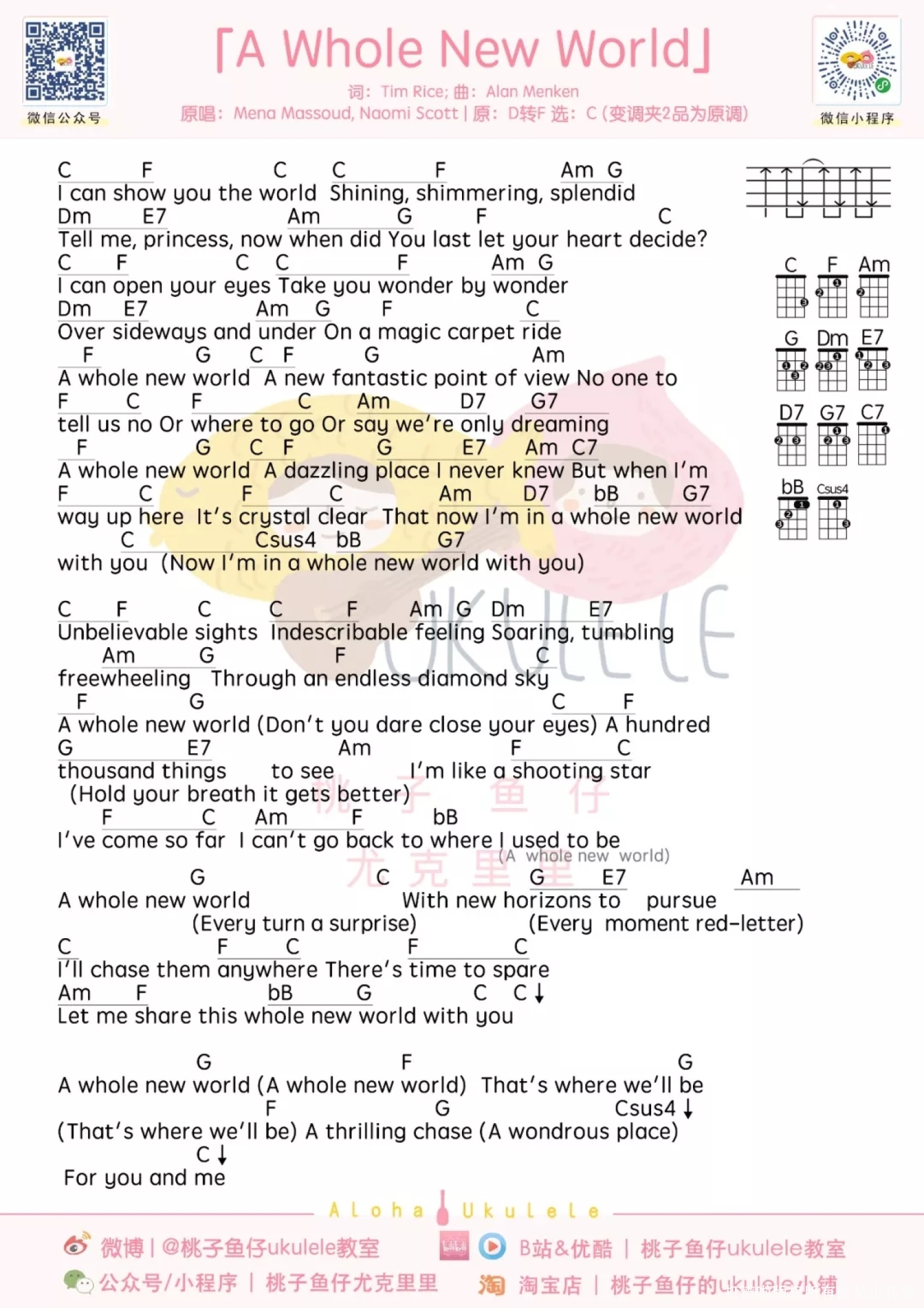 曲谱介绍: A Whole New World ukulele 弹唱演示   “如果你有阿拉丁神灯~ 你想许什么愿望?” “我想要无数个愿望” 神灯:再见! 迪士尼翻拍真人版《阿拉丁》 大家免不了心怀期待 当年那部神奇的动画 究竟能否翻拍的同样令人惊艳 其实导演也是顶着很大的压力 事实证明电影上映后 也是满足了多数人的期待 惊喜连连 童年时的我们都喜欢童话 女孩子更多的可能是把自己代入 这正是看童话的乐趣所在 作为公主同时拥有一段轰轰烈烈的奇幻爱情 这可是很多女孩子的梦呀 然而现实都是:童话里都是骗人的~ 我们没有神灯 不是公主 没有完美的爱情 姐妹快醒醒呀! 迪士尼是我们永远的梦   A Whole New World ukulele弹唱教学   A Whole New World ukulele谱