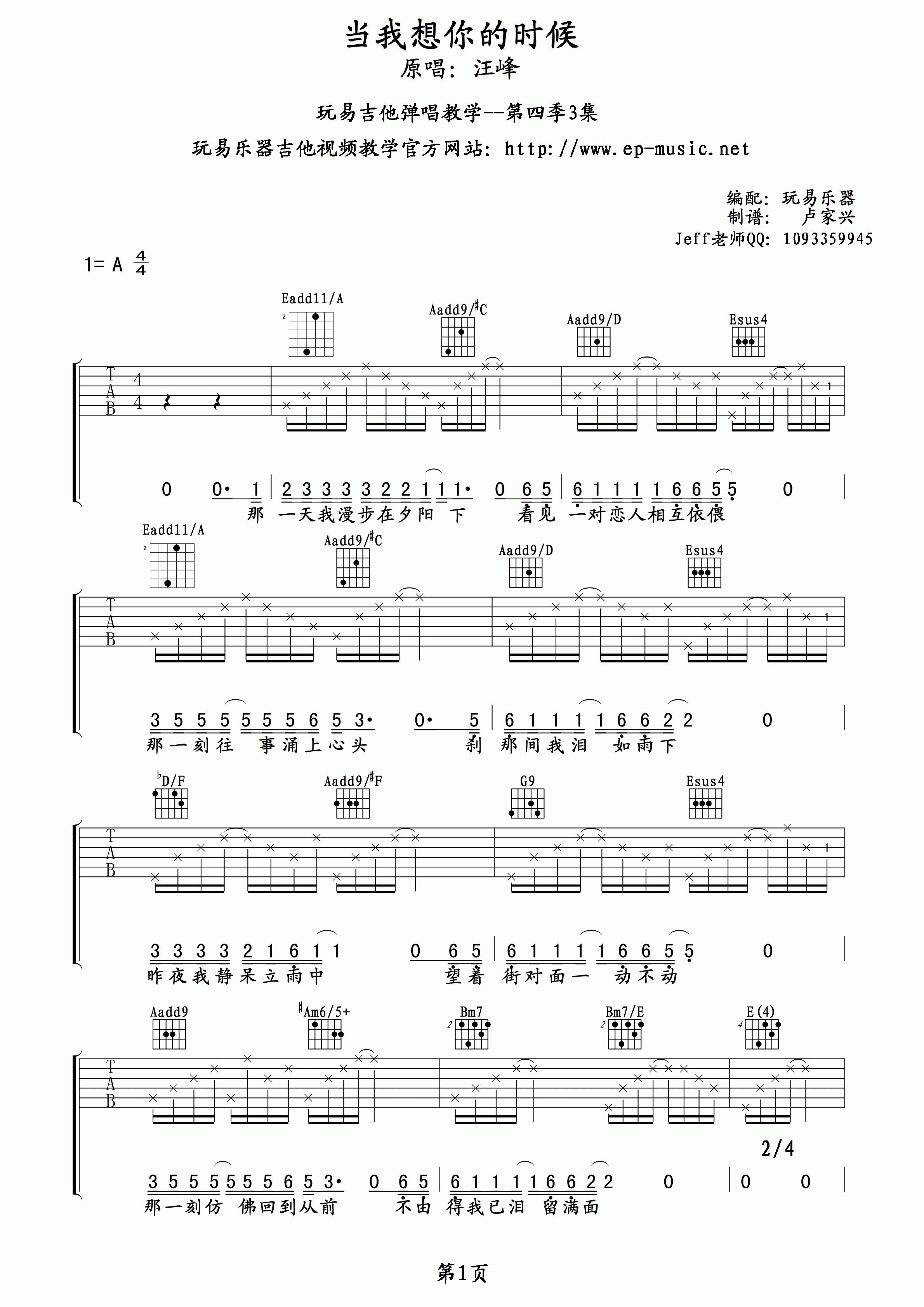 曲谱介绍: 当我想你的时候吉他谱,A调版吉他弹唱谱,来自玩易吉他编配分享。吉他谱采用A调和弦指法,和弦用了很多的转位和弦,应该是网络上最精准的版本之一,附教学讲解视频。汪峰《当我想你的时候》,没有真假声转换的技巧,也没有R&B的蜿蜒曲折,直抒胸臆的表达更加直接。即使十年,即使成年,我们还是不得不去正视心底软弱的那个角落,无可遁形。