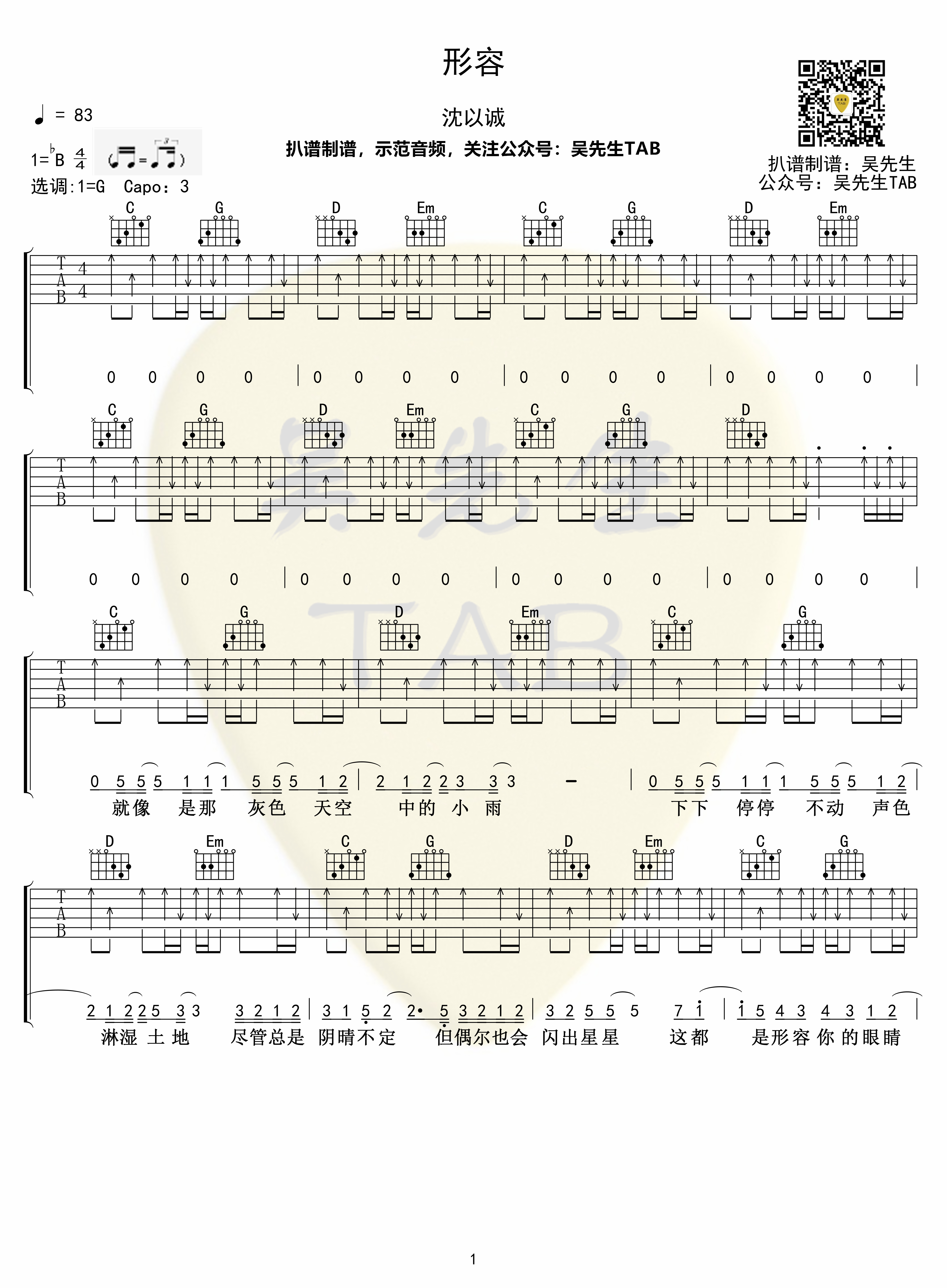 曲谱介绍: 沈以诚《形容》,到底要用怎样的文字,怎样的心情去形容你呢?喜欢一个人,就这么不可自拨。那些热烈给你,那些欢喜给你,整个世界都想要送给你,过去未来,你都是不可替代的那一个。 吴先生 形容吉他谱,G调指法版吉他六线谱,来自吴先生编配,共四张高清图谱,唱原调变调夹夹第三品。