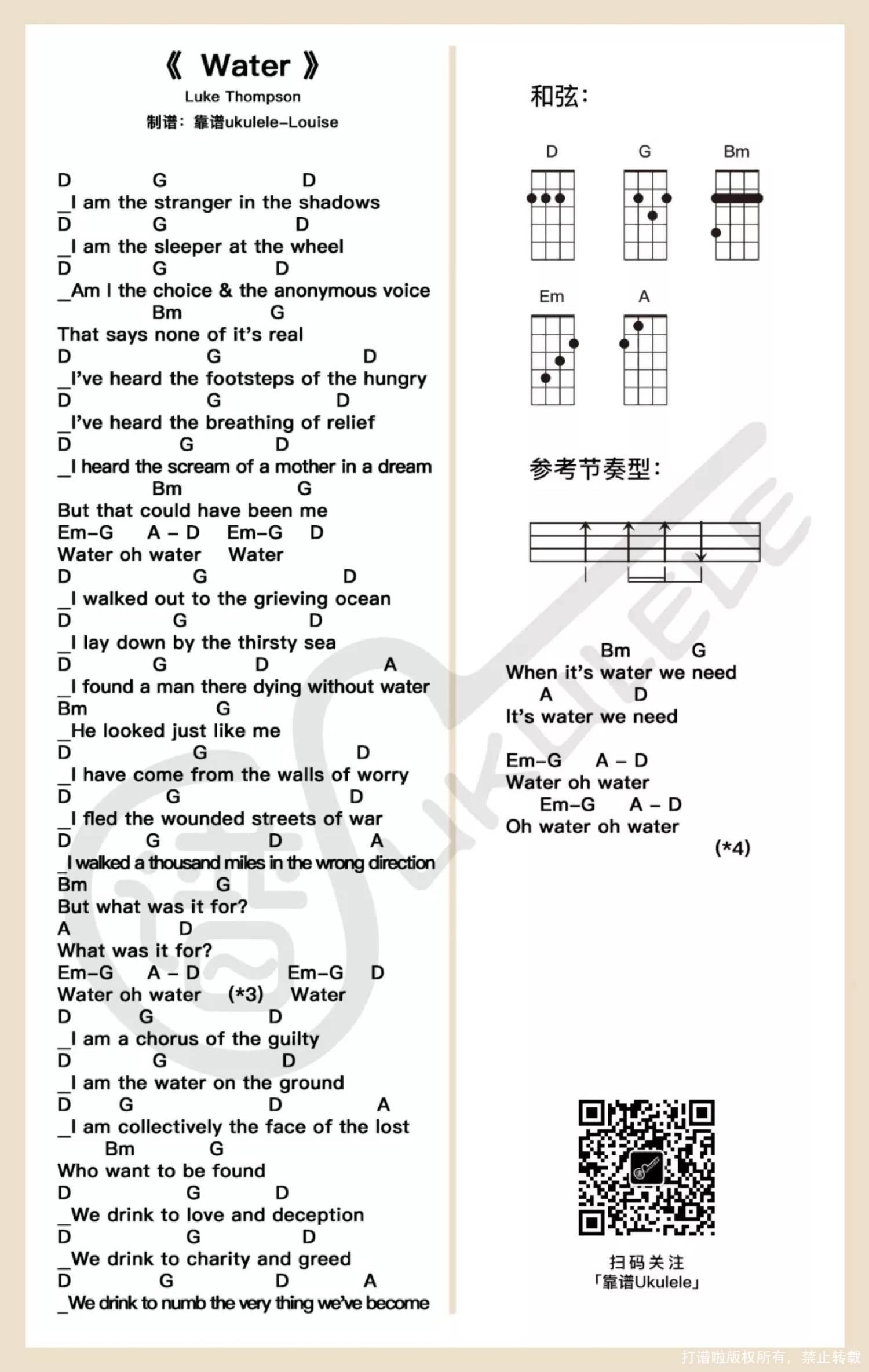 曲谱介绍: 这一首求谱来的(求谱制作都比较慢咯,任性的我改随机打谱了……,有些歌咋一听很好听,做谱的时候就有些抗拒了……(●—●)因为歌手唱歌有自己的特点,get不到点会很压抑哈哈哈哈哈)。 歌还挺好听的,很不一样的调调,答应了尽力而为了(不知道求谱的宝宝还在不……) 这首歌求谱到现在其实时间不短了,一直卡着……Luke Thompson唱歌的感觉不是那么好找,反正我学唱失败了……但是谱子还是尽量做了,由于单词发音唱出来的感觉不是很懂得要怎么形容,基本上就是把和弦标注在了单词上,至于唱某个单词什么时候切换和弦的部分,就真的只能看每个宝宝自己弹唱时候找判断了…… 这次的谱做的有点小担心,不是很有把握的……反正都仅供参考。 难度系数:★★ 考虑到我学唱失败……难度系数提高了半级,和弦不难啦,都是我打谱常见的和弦。 稍微说一下Water有出现到Em-G和A-D这种的,就是这个单词用到两个和弦每个和弦至少一组完整节奏型。 节奏型口诀:(下~下下上),记一下吧。   ​Water尤克里里谱