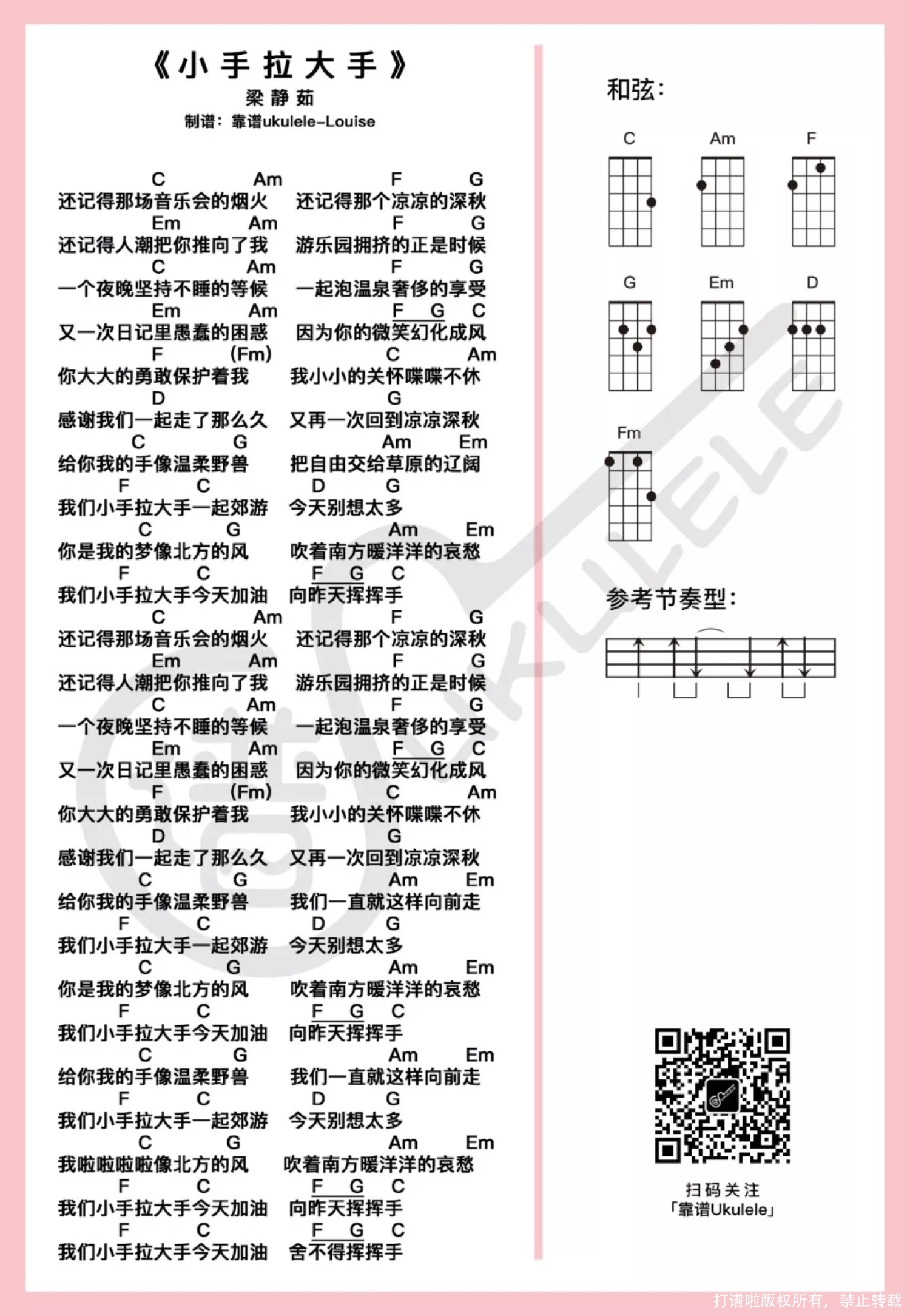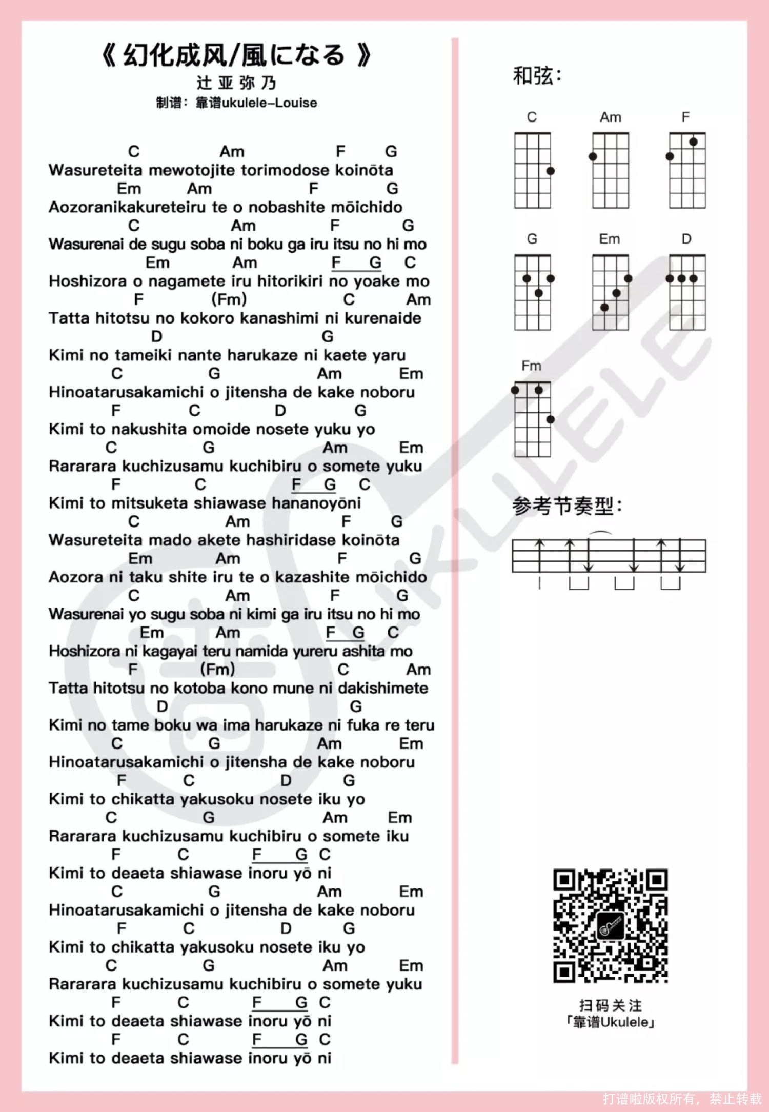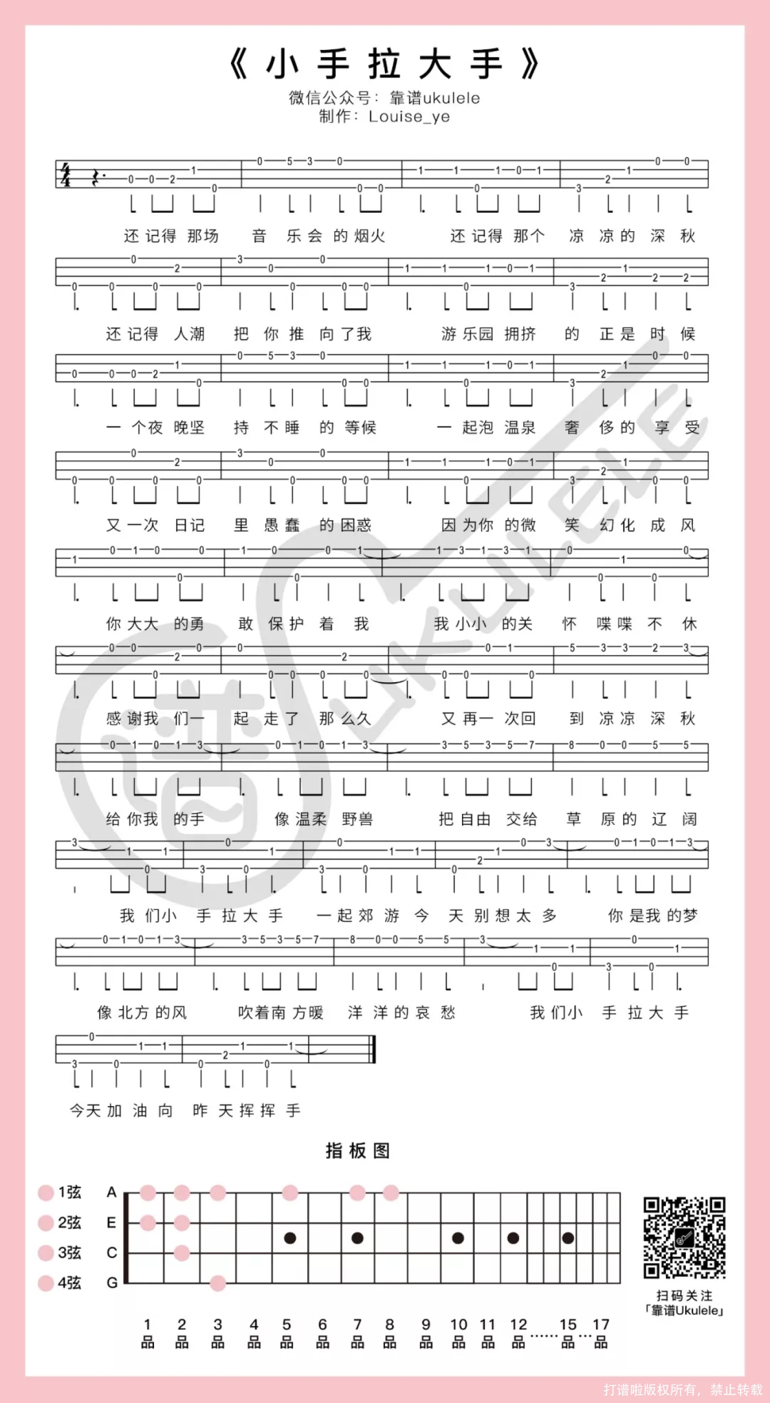 这是我自学尤克里里弹唱学的最早的歌之一,突然发现刚开始学弹唱的都是选的梁静茹的歌呢(可能是跟看的教学视频有关系,看到的都是她的歌,是很喜欢的女歌手之一)。 有注意到这首歌的填词是陈绮贞(很喜欢她特别的嗓音),一个才女,她的歌找机会也要做一两首出来分享一下才好……(光有链接谱……还都是比较早期的分享,多少有些问题的那种……哈哈哈),提到填词自然要提到原唱了,这首歌其实熟悉吉卜力动画作品的盆友们应该都不陌生的,它是《猫的报恩》的片尾曲,原唱是日本歌手辻亚弥乃(词曲也是她!!!)。《小手拉大手》是这首日文歌曲翻唱版本里面最有名气的啦(好像还有其他歌手也有翻唱作品来的,基本被我忽略了……)。 小手拉大手ukulele弹唱谱 难度系数:★☆ 喜欢这种和弦简单的朋友,这首歌真的强推荐练一下呢(就是因为我喜欢这首歌,必推荐练习曲目!~哈哈哈哈哈跟我学琴的都有接触过这首)。 节奏型对初学来说是不好快速上手的那种,刚开始练习的时候,可以先练习和弦的切换,直接用下扫开始下手,稳住节奏,配合好了弹唱,再把这稍显复杂的节奏型搭配上去一起。 Fm和弦之所以用括号表示是如果你对这个和弦陌生且按得不是很好的话,可以就忽略,用F和弦替代,当然用Fm和弦是更好的,可以慢慢来。 节奏型口诀:(下下上~上下上),记一下。 小手拉大手的原版其实是日文的幻化成风,相信如果有像我一样因喜欢宫崎骏动画从而也喜欢吉卜力动画的小可爱,一定一定知道《猫的报恩》,一定听过这首《幻化成风/風になる》。那原唱你们知道吗? 辻亜弥乃つじあやの 早年的音乐多为民谣式的小品,配以小巧的夏威夷四弦琴,一派置身田园海滩的风情。 当她的《幻化成风》被选为吉卜力动画《猫的报恩》主题曲之后,她的歌声也逐渐为我们所熟悉。 清新、自然、充满邻家女孩气质的音乐,在浮华嘈烦的流行乐坛,显得如此的清浊不染、至纯至真。 其实还是比较喜欢日文版,可惜日文自学的七七八八的…… 这应该是在分享了一首韩语求谱之后第一首完整版的日文弹唱分享吧,由于一些发音跟中文写法的关系,可能在一些和弦的标注上会有一些误差,所以也是给了两个版本(日文歌词版&罗马拼音版,仅供参考~!)。 如果有不合适地方,欢迎懂日语的朋友下方留言告知大家~。 幻化成风ukulele弹唱谱 难度系数:★☆ 其他说明同中文翻唱版本啦~(偷懒……嘿嘿)。 唯一要强调的地方就是Fm和弦的部分了,用括号标注,意思是可以不用它,使用F和弦的话也是不会有太大影响,只是换成了Fm和弦的话听上去是会更舒服一些的。 Fm和弦指法建议:食指1品4弦;中指1品2弦;无名指3品1弦(如果有困难,记得加强日常练习,可以在公众号「自学分享」菜单中-「小U学习」找关于爬弦的练习了解一下~)。 听一首甜甜的歌,无论你是否恋爱,都能感觉心情很好,这是我喜欢这首歌的原因之一,它能唤醒一些说不出的小情绪,能让人的心情很好,也许不经意哼唱的时候,会有那么一个人也受到你的影响哼着那个旋律~快乐的情绪是可以分享的~你说呢? 在MV里梁静茹除了有拿尤克里里弹奏外,还有一个乐器看着很像尤克里里又有点像吉他——它叫曼陀铃,声音跟尤克里里很相似。也是有过一段时间很想试试看的乐器呢,希望以后有机会尝试一下~ 小手拉大手ukulele单音指弹谱 难度系数:★☆ 移调到这个程度已经是不能再简单的啦,很多空弦音就可以弹起来的一首歌,偶尔需要按个7品、8品(频率也不是很高,所以不用担心),指法就需要稍微注意点,不然会卡壳。 偷偷告诉你,如果看到3品4弦觉得不开心,其实你可以换成1品1弦,他们是同一个音来的呀,不信你可以去看→简单乐理←(或看最后那张指板图)。