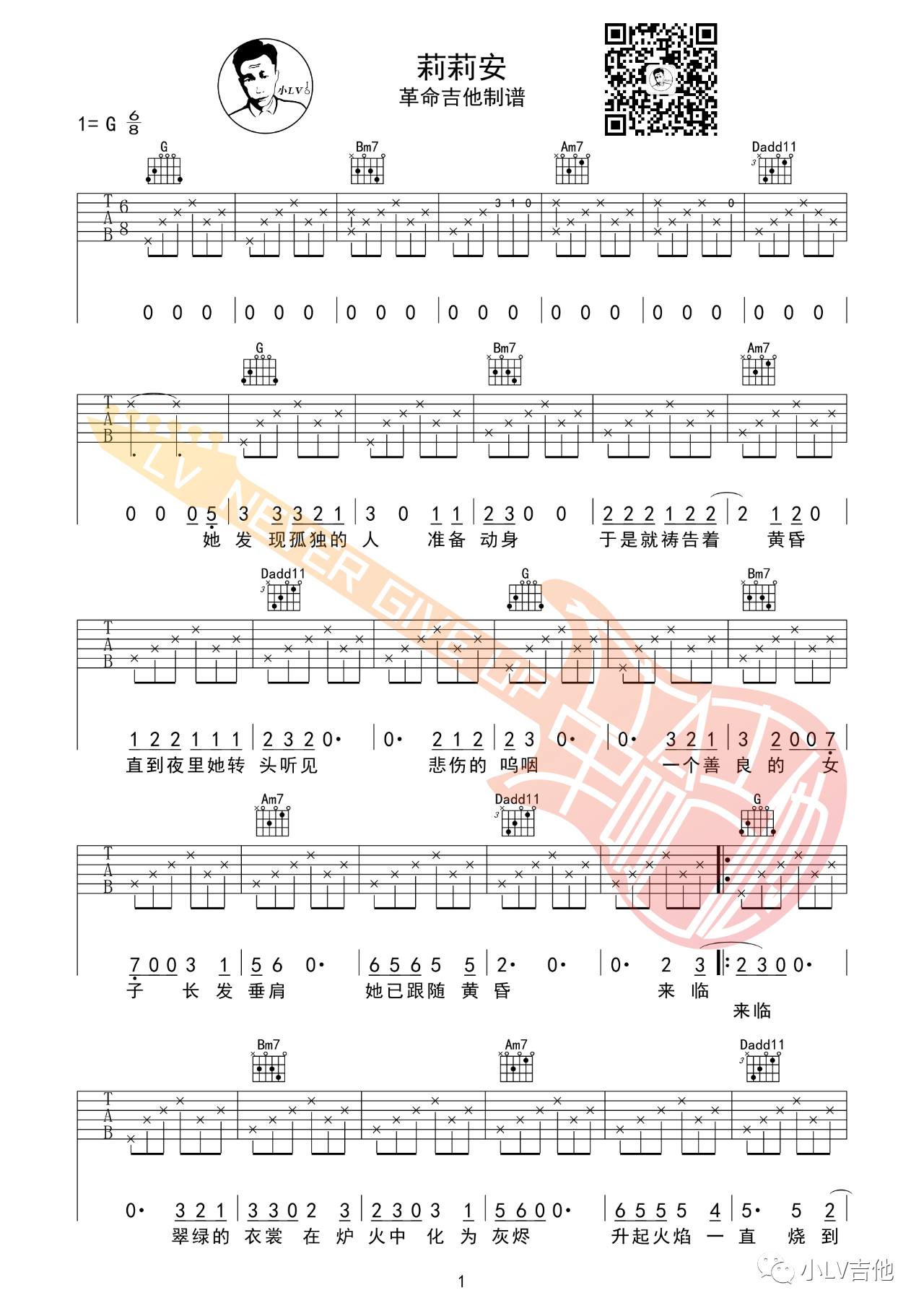 曲谱介绍: 宋冬野《莉莉安》,借着平淡的歌词,唱着平淡的故事,让人心里莫名的平静,或许这就是民谣的魅力!莉莉安吉他谱,G调编配版吉他六线谱,来自小LV老师编配分享。歌曲的演奏只用了四个和弦,而且没有横按,右手的伴奏型也很简单,大家参考教程弹起来吧。