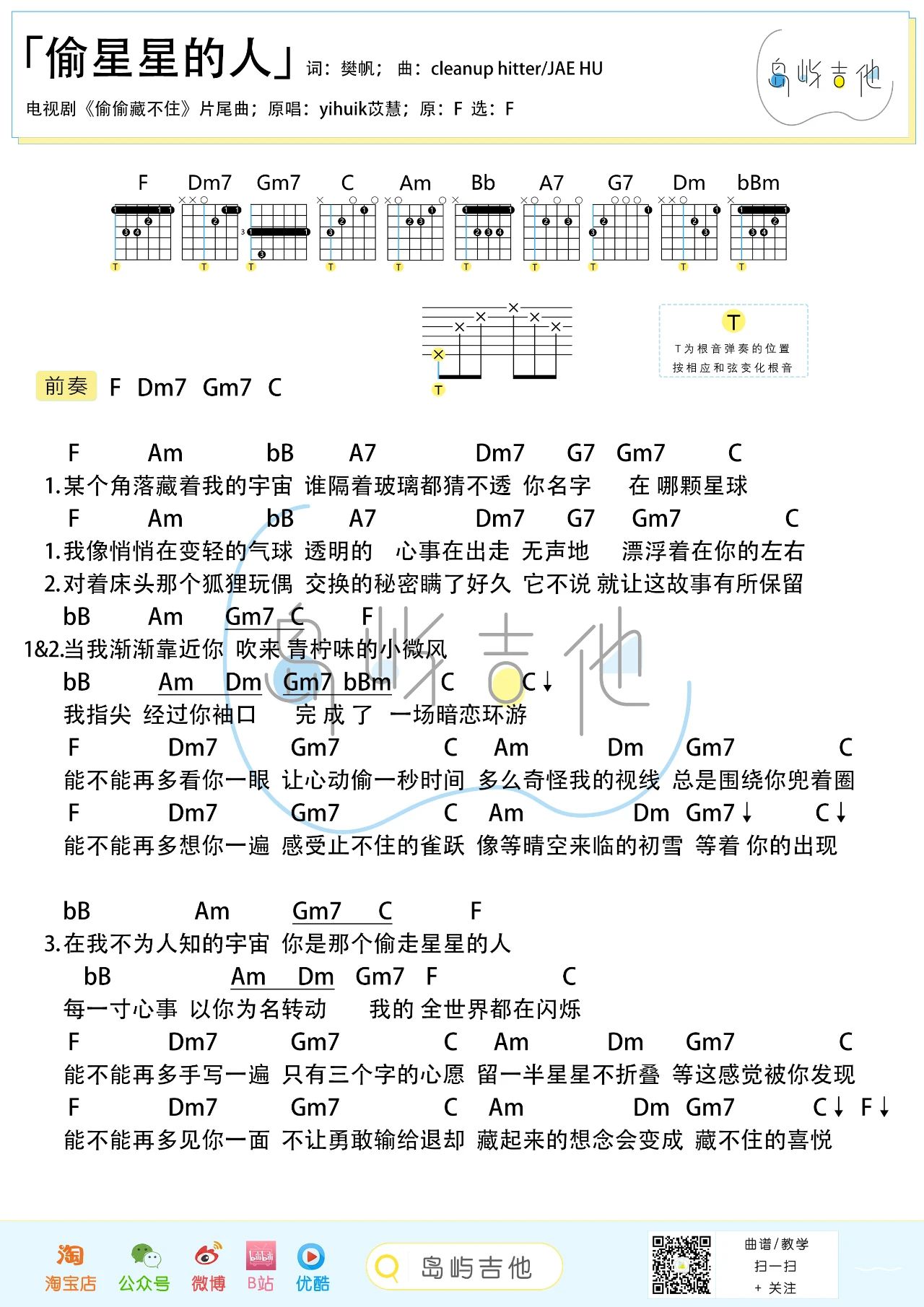 曲谱介绍: yihuik《偷星星的人》,《偷偷藏不住》的插曲。在这场暗恋里,我是偷时间的人,因为每次看你一眼,就仿佛过了好久好久。我的眼睛看过你的眼睛,指尖经过你的袖口,每折一颗星星,都写上了你的名字,而你毫不费力偷走了我全部的心事。当青柠味的微风吹起,想再多看你一眼,突然发现,暗恋是藏得住的,但喜悦是藏不住的。偷星星的人吉他谱,F调弹唱和弦谱,一共用到10个和弦,和一个节奏型。主要难度是F调和弦的掌握及熟练。