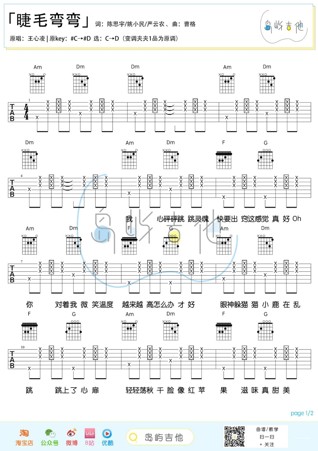 曲谱介绍: 我心砰砰跳跳,灵魂快要出窍,这感觉真好。王心凌《睫毛弯弯》,一首俏皮的老歌,无论什么时候听都洋溢着快乐的味道。睫毛弯弯吉他谱分享,来自岛屿吉他编配制谱,C转D调版弹唱吉他谱,相比原调需要降半音调弦。吉他谱上的方框表示拍弦技法,整体难度一般。