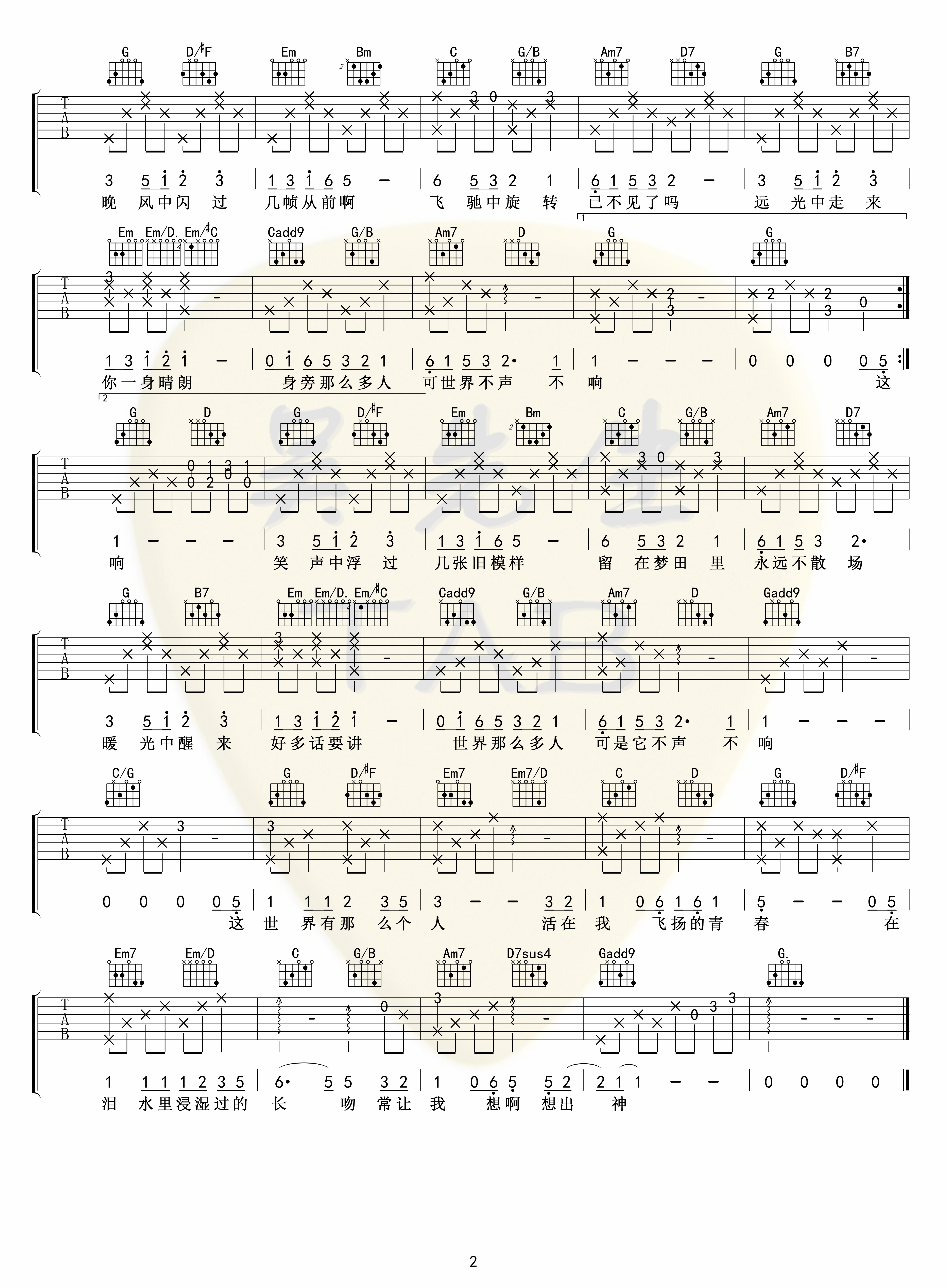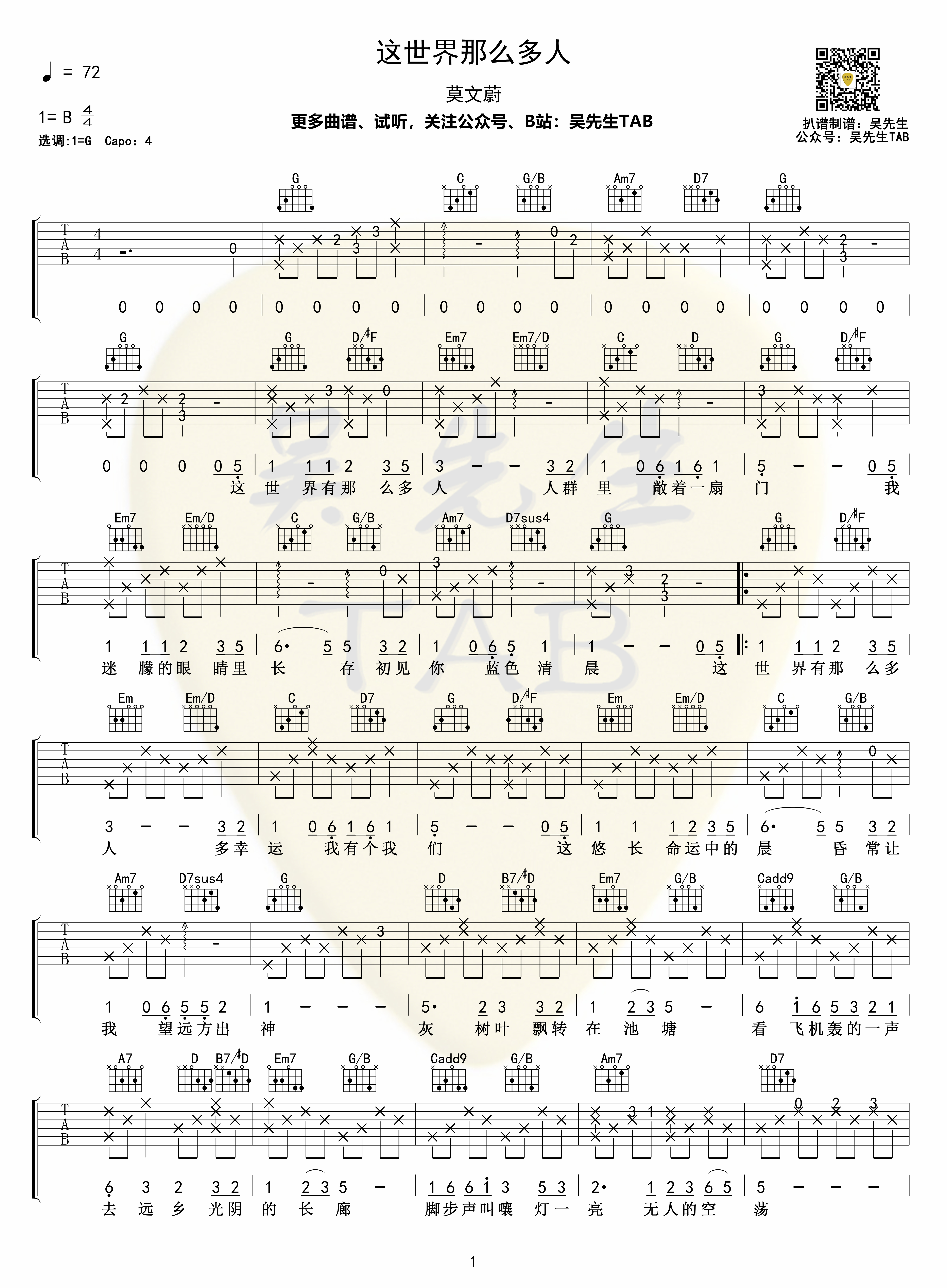 曲谱介绍: 莫文蔚《这世界那么多人》,这世界有那么多人,我却遇见了你,多幸运生而平凡的我有了我们,一起度过彼此生命中的青春。轻触时光,一些念,一些梦,一些人,都成为了彼此最美的年华。这世界那么多人吉他谱分享,来自吴先生编配吉他谱,G调高清版弹唱吉他谱,附弹唱演示音频。歌曲的演奏部分不难,难点在于弹唱的结合。 吴先生