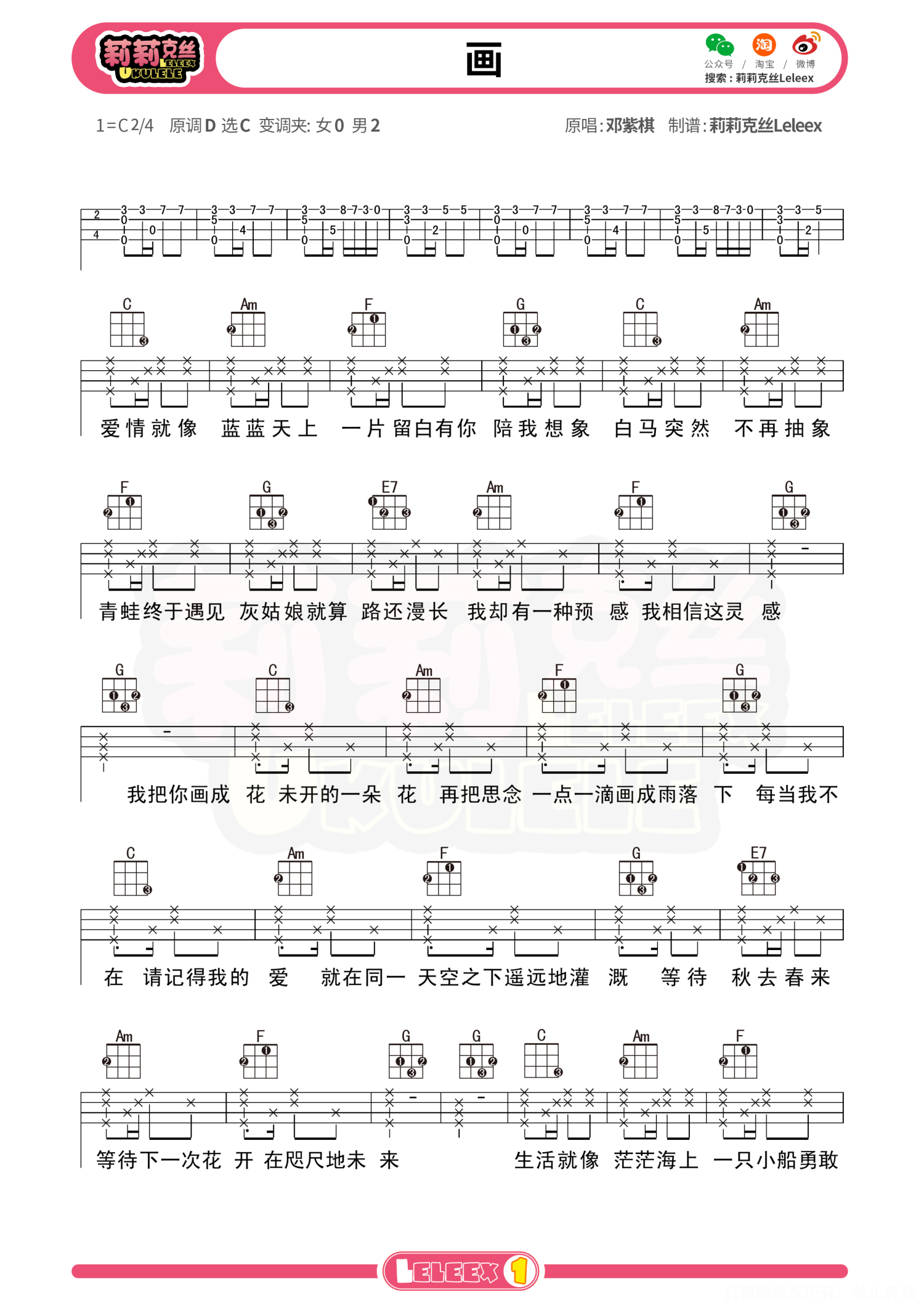 曲谱介绍: 《画》尤克里里谱-邓紫棋 莉莉克丝 更多尤克里里曲谱/教学  关注@莉莉克丝Leleex
