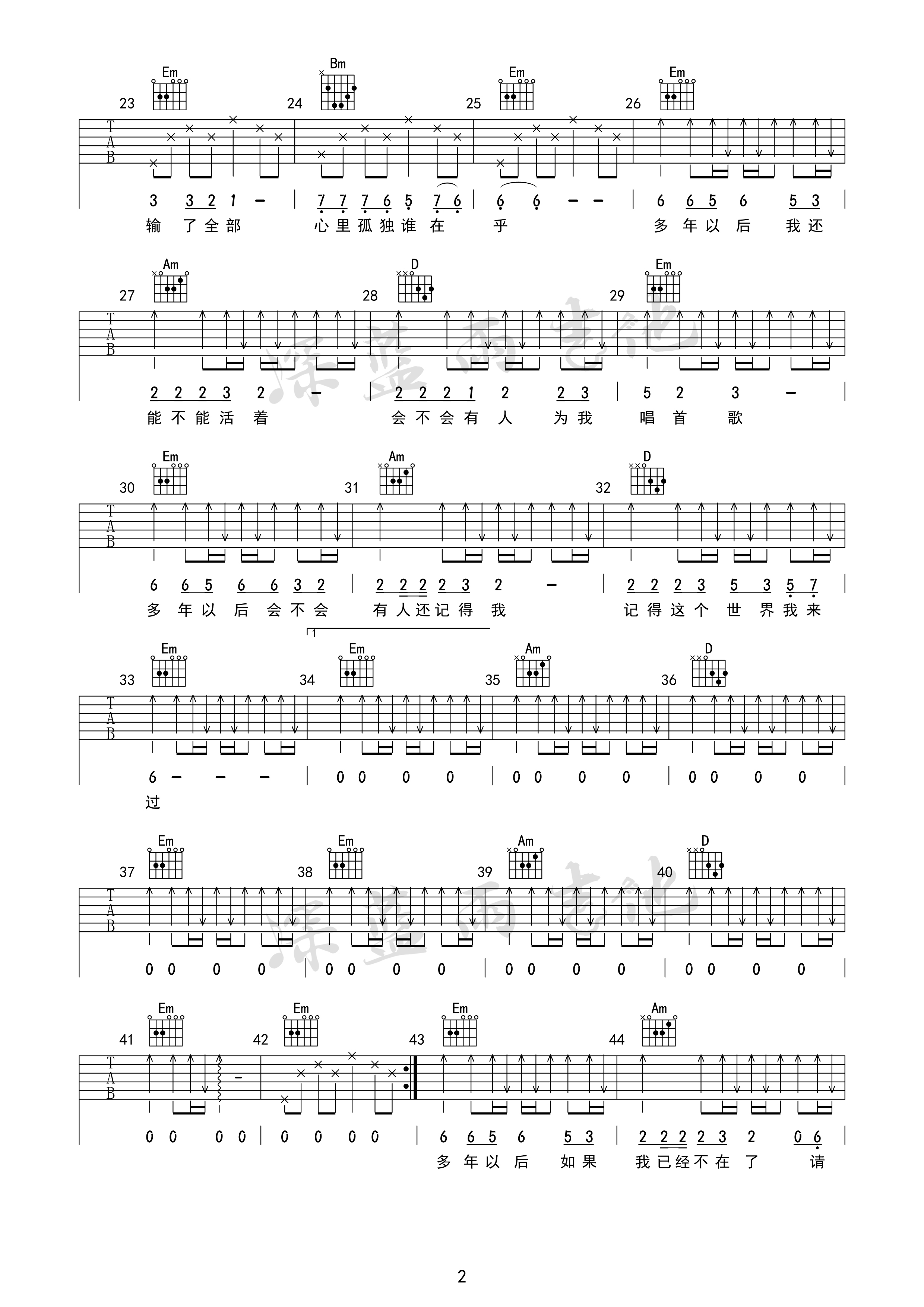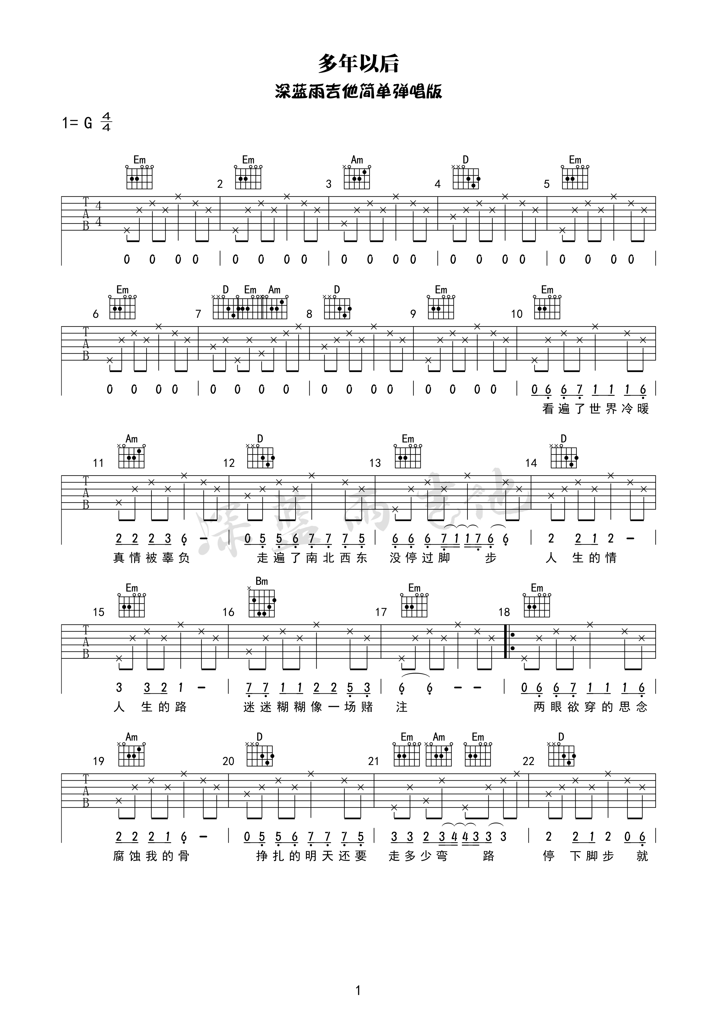 曲谱介绍: 大欢《多年以后》,人生如梦,走过的路,爱过的人,以及铭刻在那颗心中的美丽誓言,永远铭刻在心底。多年后,我们尘归尘土归土,名字叫安乐。多年过去了,还有人还记得这个世界吗?如果你还爱我,请为我唱这首歌。多年以后吉他谱,G调版吉他弹唱谱,简单弹唱版,来自深蓝雨老师编配分享。教学视频是进阶版,新手朋友可以练习下方的简单版。