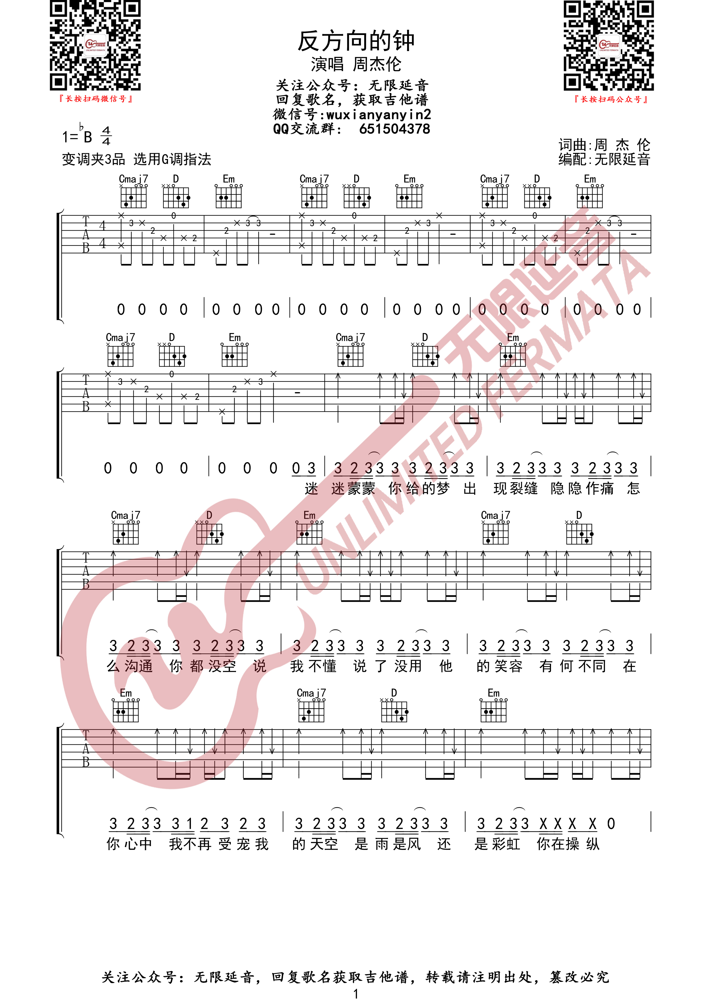 曲谱介绍: 周杰伦《反方向的钟》,可能对比起周董的其他经典来说,这首歌喜欢的人并没有那么多。如果将时钟反方向拔动,让时光倒流,你敢保证你会有不一样的选择吗?反方向的钟吉他谱分享,高清G调版吉他弹唱谱,来自无限延音编配制作,原调bB调,变调夹夹第三品弹唱,演奏难度★★☆☆☆。