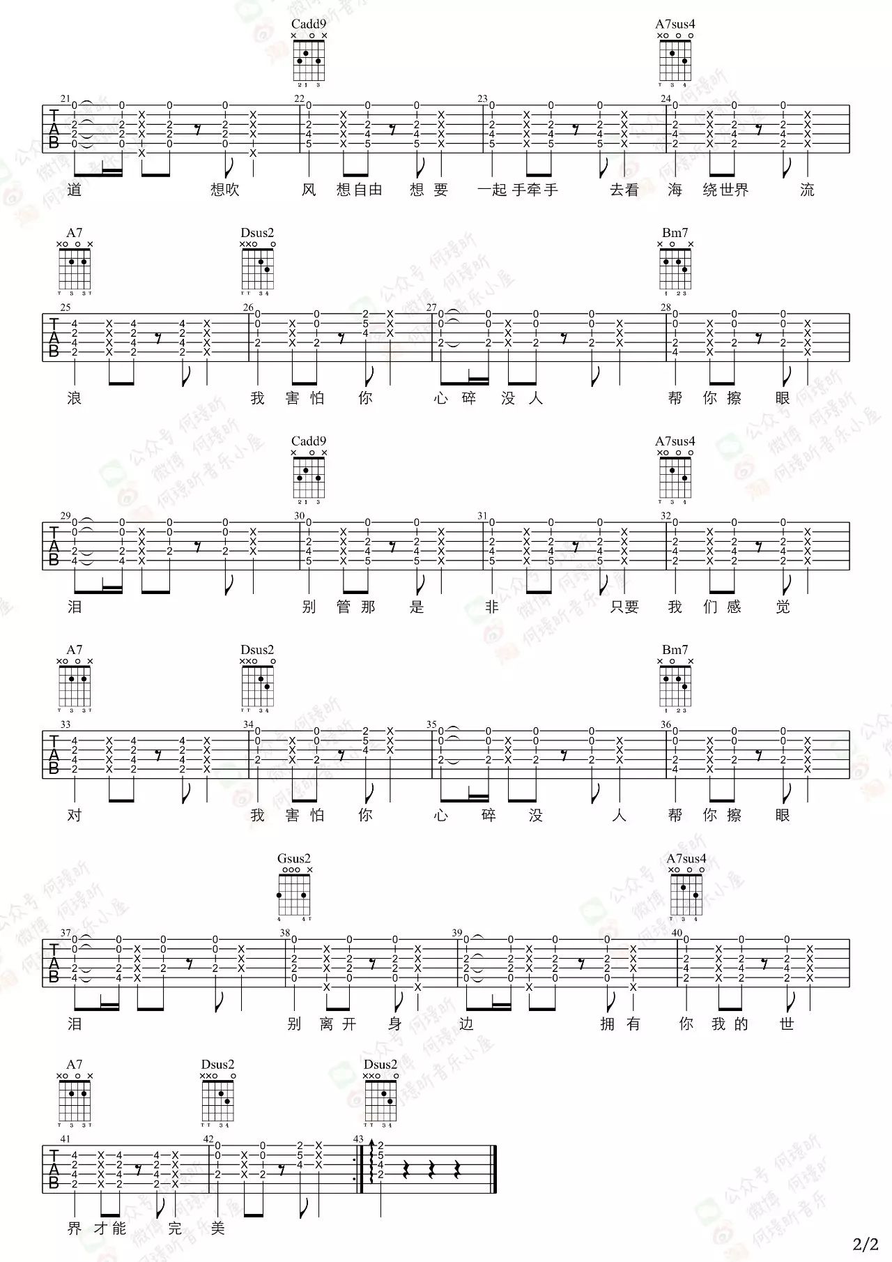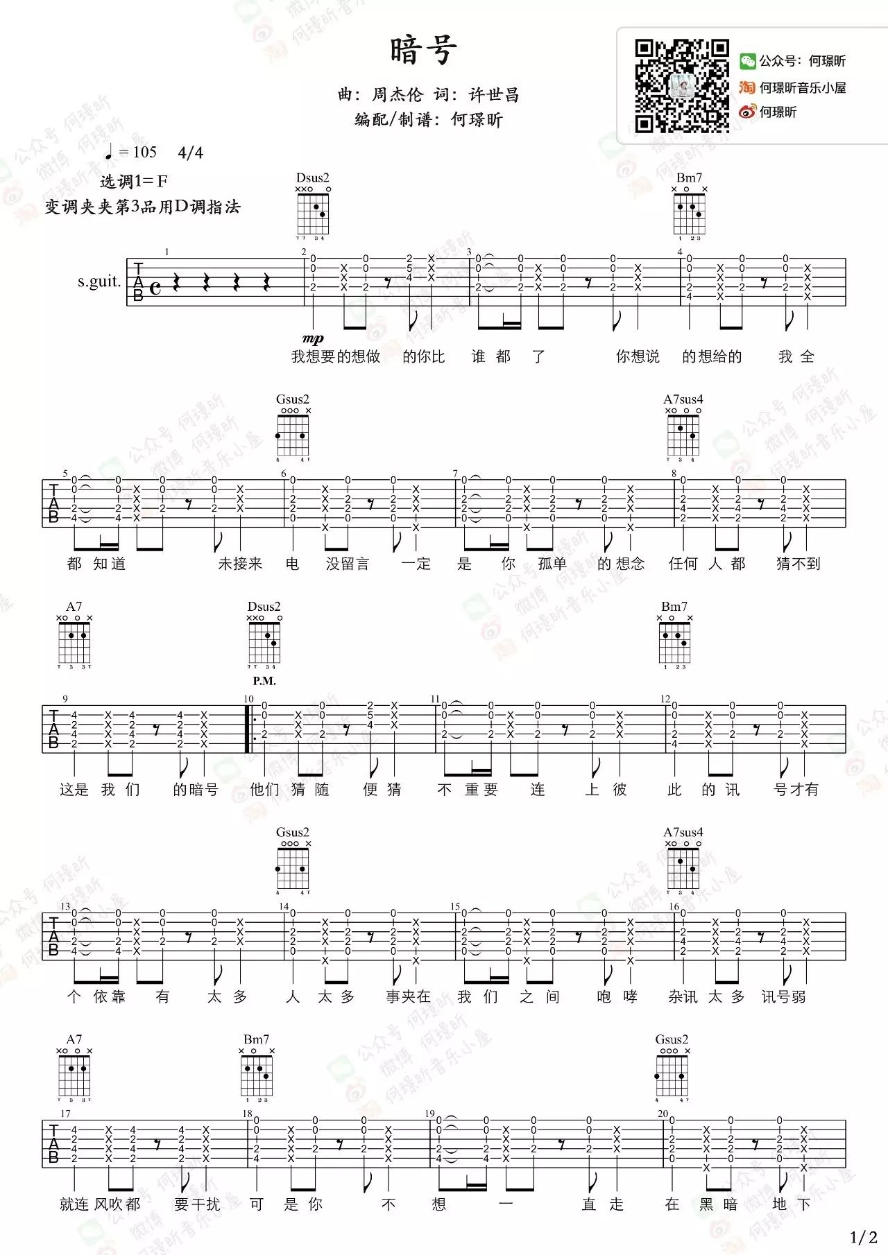 曲谱介绍: 暗号吉他谱,来自何璟昕编配吉他谱,D调指法和弦,变调夹夹第三品弹唱,原调F调。和弦比较简单,主要难度在于右手节奏的准确掌握。太多人太多事,夹在我们之间咆哮,杂讯太多讯号弱,可是你不想,一直走在黑暗地下道。想吹风想自由,想要一起手牵手,去看海绕世界流浪。其他版本吉他谱参考:暗号吉他谱_周杰伦_吉他弹唱教学视频_C调吉他谱
