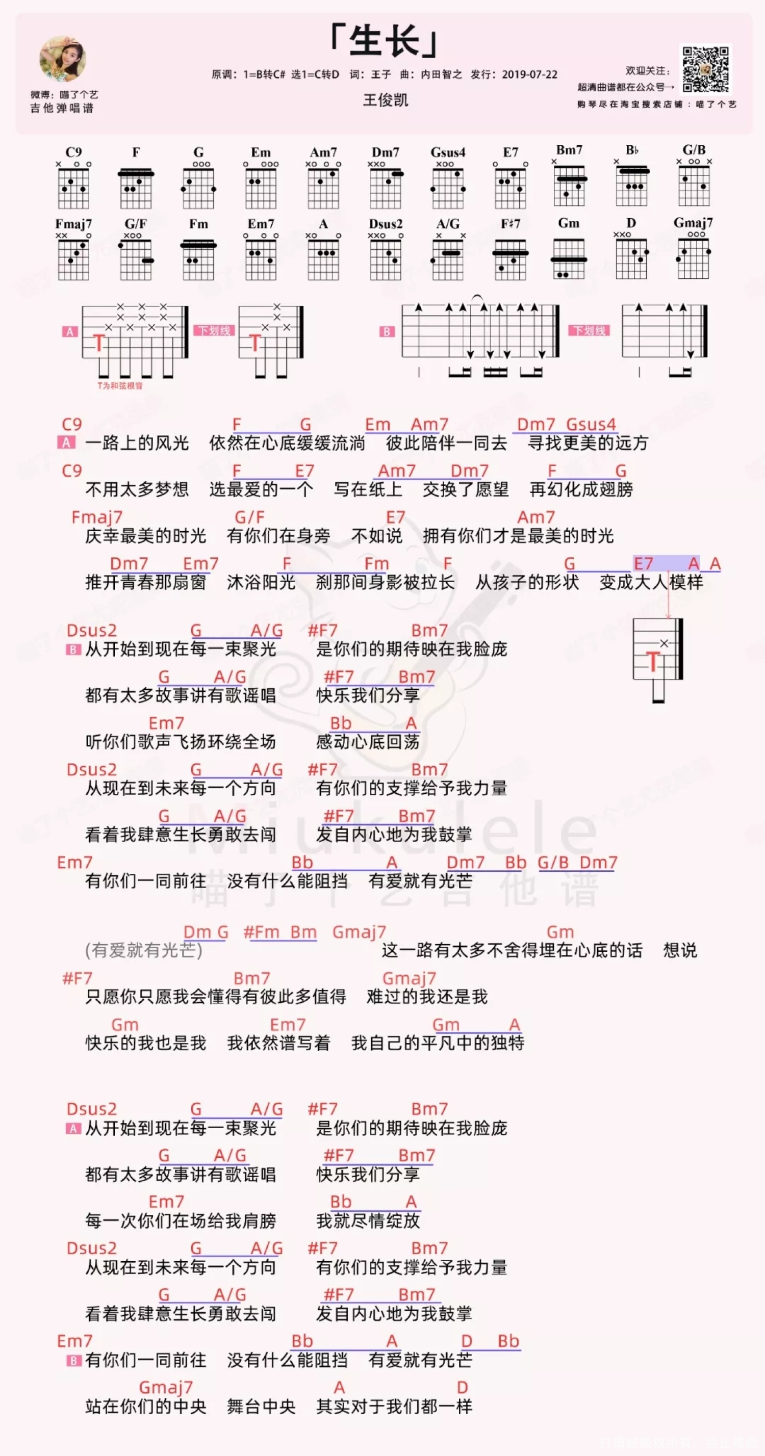 曲谱介绍: 吉他弹唱|王俊凯《生长》 从开始到现在每一束聚光,是你们的期待映在我脸庞;从现在到未来每一个方向,有你们的支撑给予我力量 祝福少年永远都能肆意生长   生长弹唱视频   生长尤克里里谱   生长吉他谱