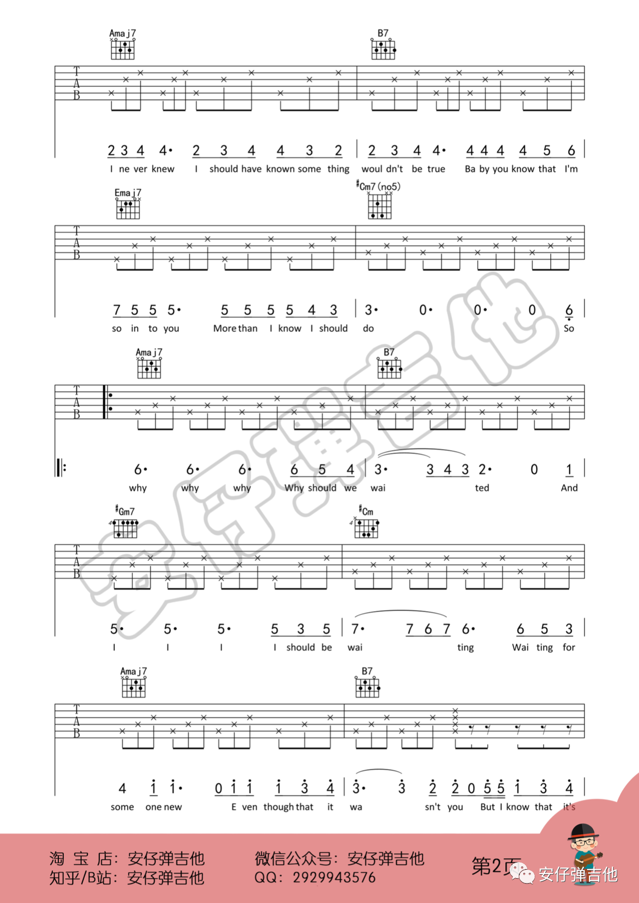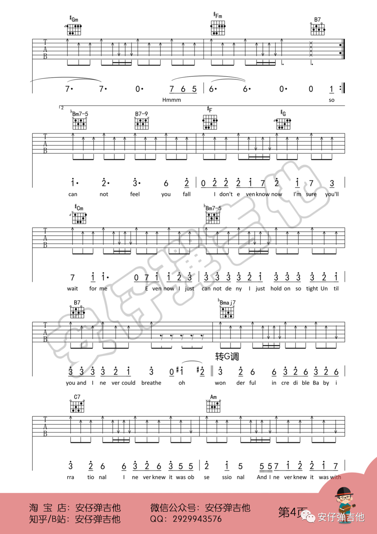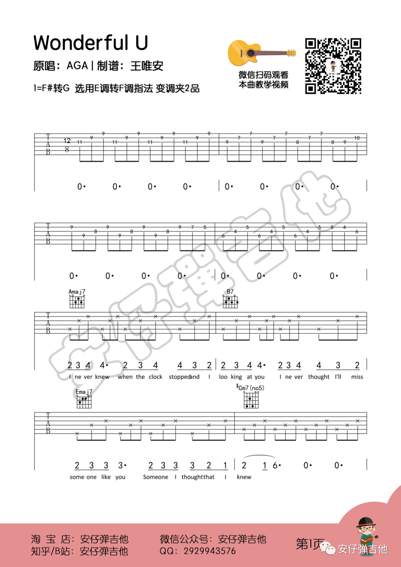 曲谱介绍: Wonderful U吉他谱,来自安仔弹吉他编配吉他谱,E转F调版吉他弹唱谱,既能满足女生唱又能满足男声唱,附教学视频讲解。这首歌的主歌和声进行:4516,副歌和声进行:45364(2)5。副歌唱第二遍的时候,用到一个Bbm7-5和弦非常精彩,因为旋律里主要音是mi,Bbm7-5的降7音正好就是mi,用来替代原先的Amaj7,原先的Amaj7的七音正好也是落在旋律音mi上。